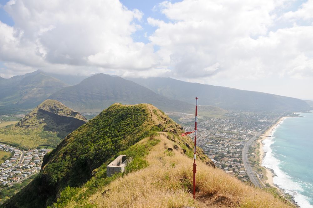 Summit und die höchste Pille -Box der Maili Pill Box Wanderung, Maili Mountain Wanderung, HI, Hawaii, USA. Dieser Ort befindet sich in Waianae, einer der vielen erschwinglichen Kleinstädte, die in Hawaii mit geringeren Lebenshaltungskosten leben können