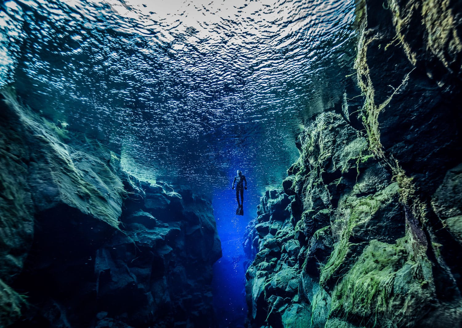 Der Thingvellir-Nationalpark beherbergt einen der schönsten Orte Islands, den man besuchen kann: Silfra. Während sich die beiden tektonischen Platten, die Thingvellir begrenzen, verbreitern, bilden sich tiefe Risse. Silfra ist einer der größten und tiefsten Spalten im Park. Das von natürlichen Schmelzwasserquellen überflutete Wasser in Silfra ist außergewöhnlich sauber und klar und eignet sich daher ideal zum Schnorcheln und Tauchen. Das bedeutet, dass Sie nicht nur zwischen Kontinentalplatten schwimmen können, sondern auch die Höhlen erkunden und die Details der Spalte unten sehen können. Da man in einem geschmolzenen Gletscher schwimmt, ist das Wasser extrem kalt, daher werden Trockenanzüge getragen, damit sich die Leute wohl fühlen.