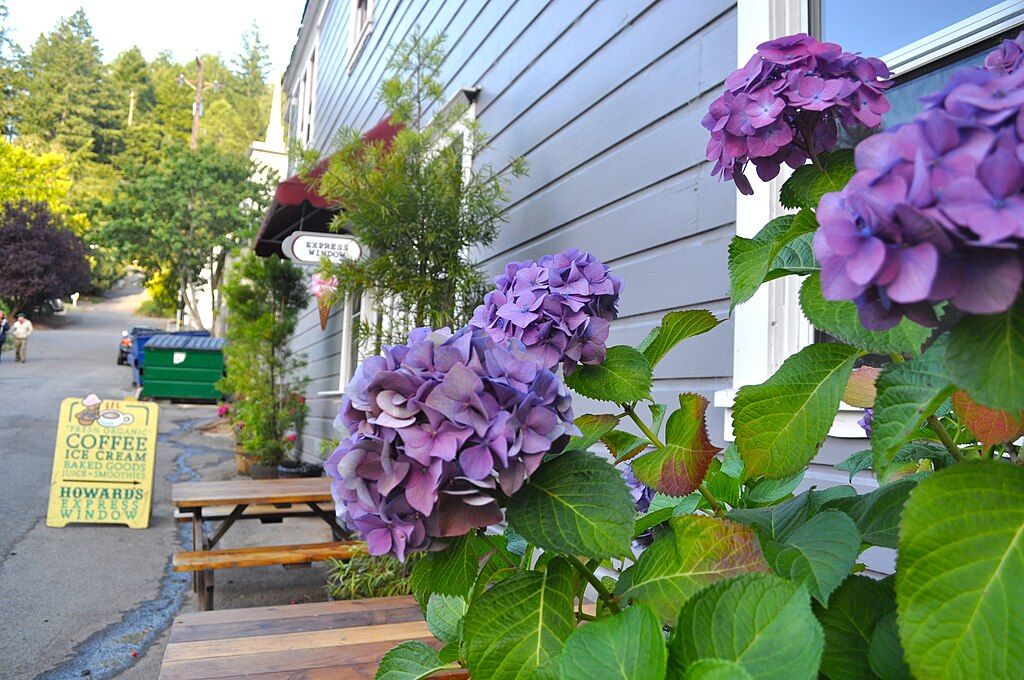 Hortensien und urige Geschäfte in Occidental, Kalifornien, USA