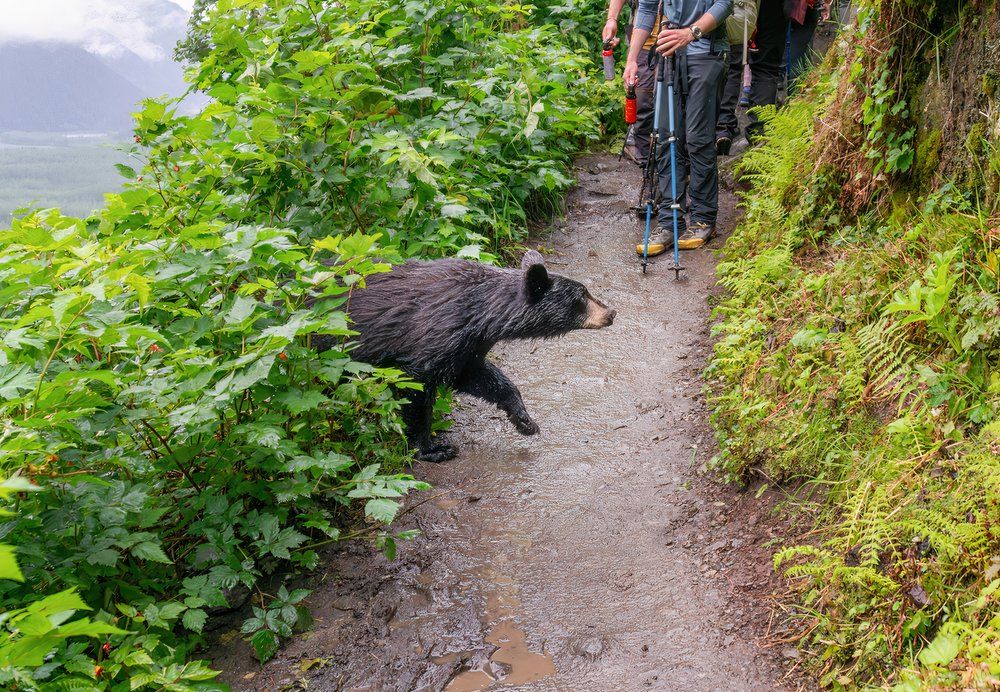 Bär läuft vor Wanderern mit Bärenspray auf einem Wanderweg im Kenai-Fjords-Nationalpark, Alaska