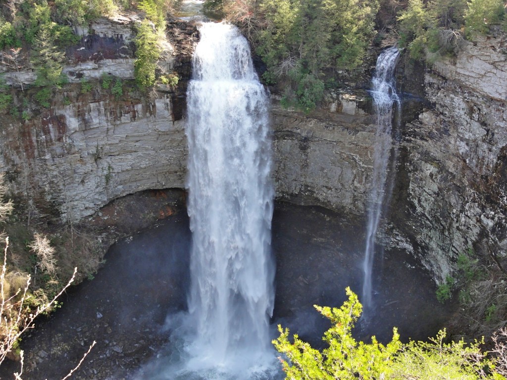 Der Zwilling fällt eher aus einer Schlucht. Der Wasserfall wurde versehentlich geschaffen, als der Caney Fork River gestaut wurde. Das Wasser fließt aus den Wänden etwa 80 Fuß über dem Fluss Caney Fork. Obwohl Sie andere kleinere Stürze entlang der Wände sehen werden, heißt dieser Wasserfall nach seinen beiden Hauptwasserströmen.