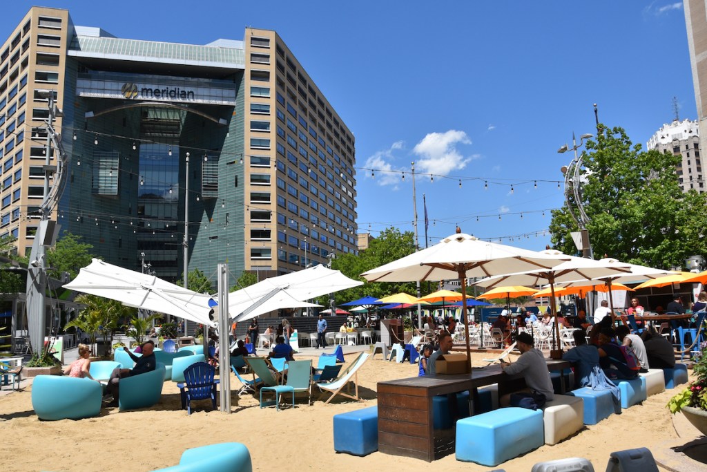 Campus Martius Parkist Detroits Treffpunkt. Dieses preisgekrönte Reiseziel bietet das ganze Jahr über Aktivitäten. Im Winter gibt es auf der Eisbahn Möglichkeiten zum Eislaufen und einen wunderschön geschmückten Weihnachtsbaum. Der Strand im Martius Park ist von Mai bis Oktober geöffnet und eignet sich hervorragend für Sommerspaß im Sand. Sie bringen über 400.000 Pfund Sand und Strandkörbe mit, damit Sie und Ihre Enkelkinder in der Stadt Sandburgen bauen können.
