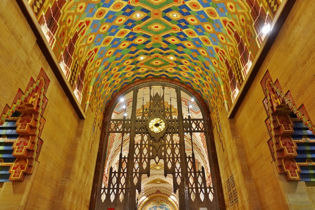 Sie können sich in der Lobby dieses atemberaubenden Gebäudes umsehen, ohne auf Tour zu sein. Setzen Sie sich und genießen Sie eine Tasse Kaffee im Lobbycafé. Wunderschöne Wandgemälde in leuchtendem Gold, Blau und Rot schmücken die Wände. Das Äußere des Gebäudes besteht aus mandarinenfarbenen Ziegeln mit einem Granitsockel.