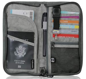 Dies ist einer der besten Organizer, die Sie für Ihre Reiseutensilien bekommen können. Diese RFID-Geldbörse verfügt über zwei Reisepassfächer, sechs Kreditkarten-/Ausweisfächer, ein Bordkartenfach, einen Stifthalter, ein Netzfach für Münzen, zwei Reißverschlussfächer für Geld, einen abnehmbaren Schlüsselbund und eine Außentasche, die beispielsweise für ein Mobiltelefon verwendet werden kann. Mit den Maßen 9,6 x 5,0 x 1 Zoll und einem Gewicht von nur 4,8 Unzen passt es problemlos in alles, von der Handtasche bis zur Tasche eines Reiserucksacks.