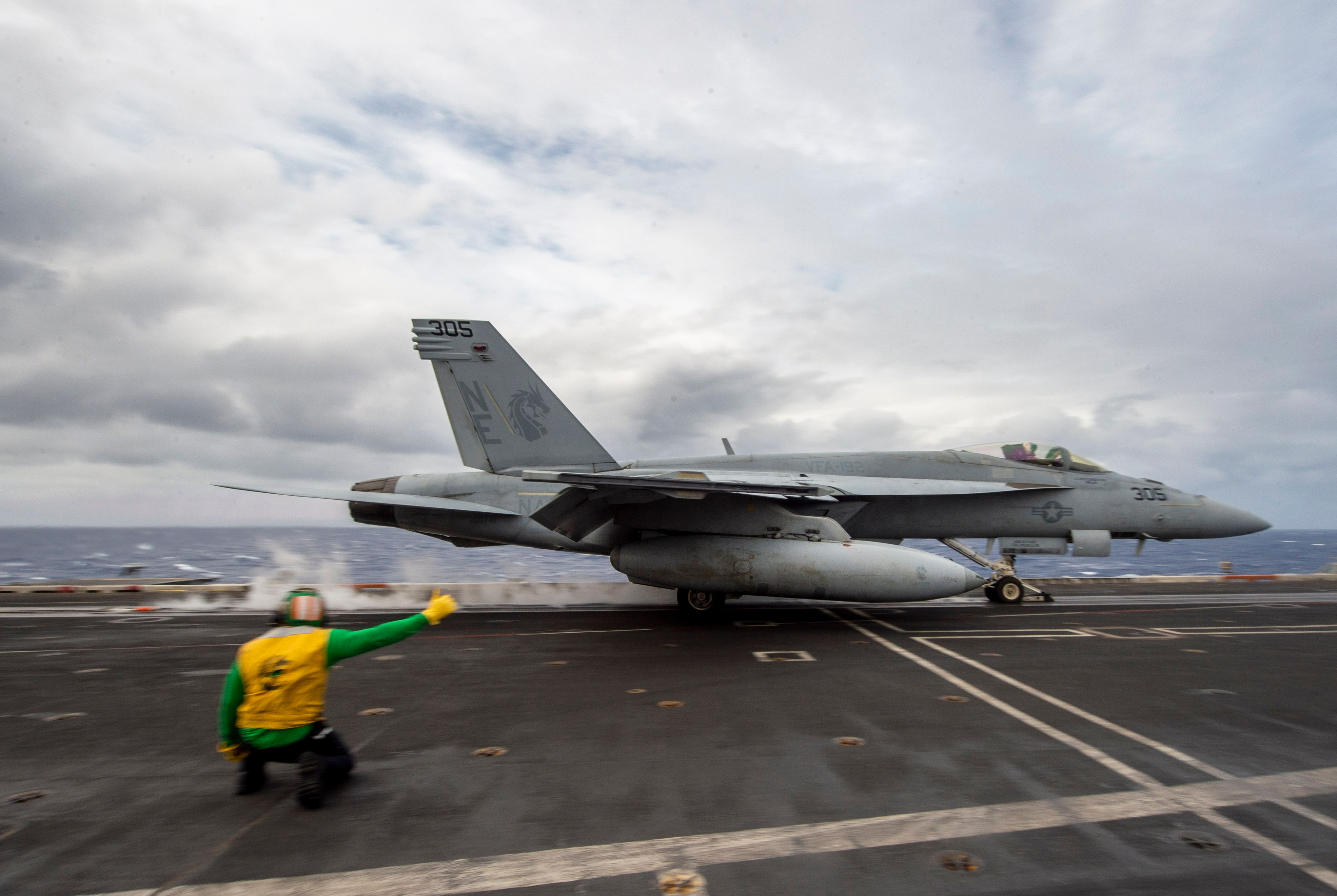 AYellow Jersey startetEin F/A-18E-Super-Hornissen, der den „Goldenen Drachen“ der Streikfighter Squadron (VFA) 192 von Carl Vinsons Flugdeck zugewiesen wurde.Der 50.000-Pfund-Zweigine-Streikkämpfer brüllte in den Himmel, nachdem er vom dampfbetriebenen Katapult des Trägers vom Bug abgeschossen worden war.