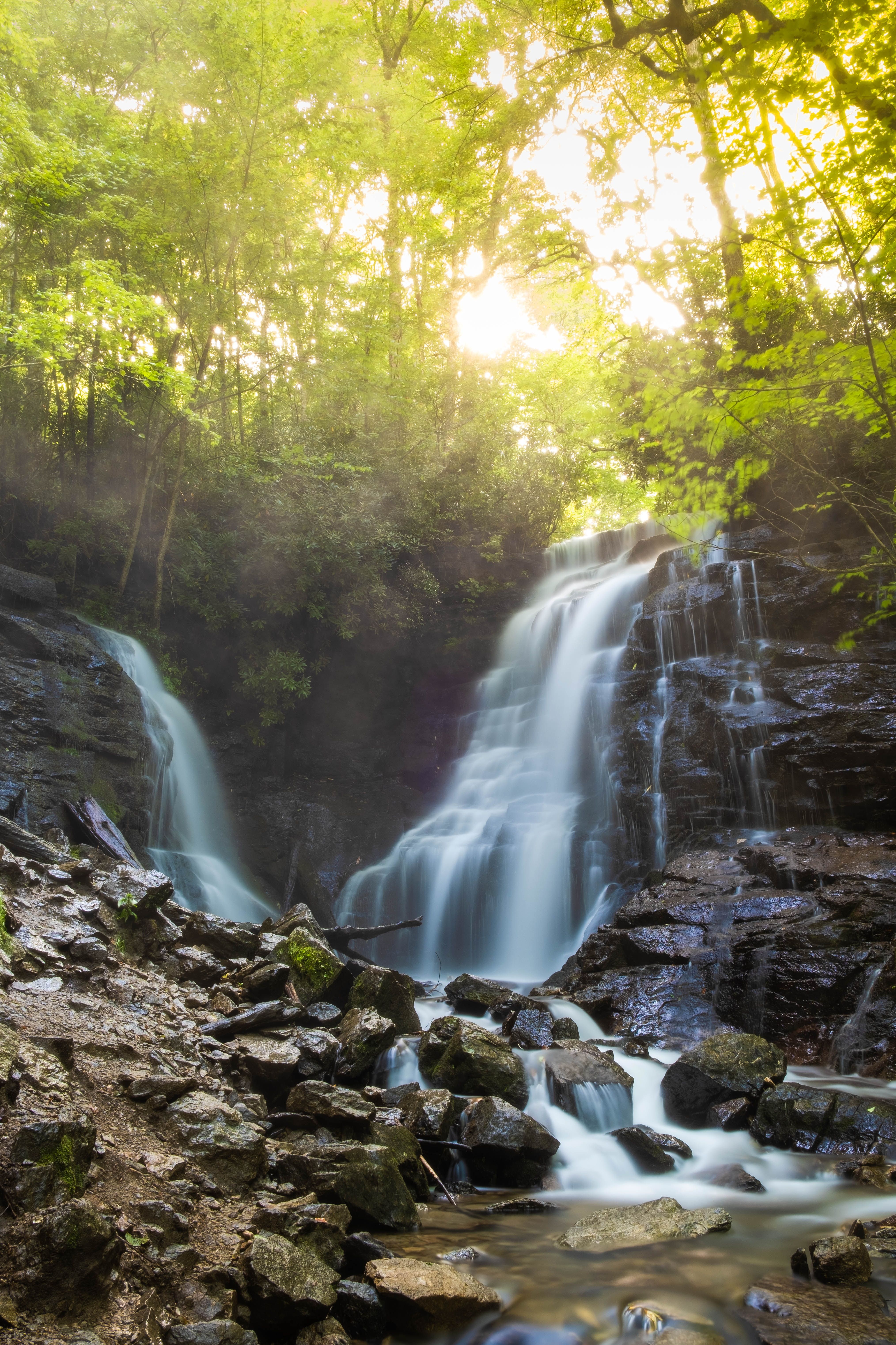 Ein kurzer, 1,6 km langer Rundweg im Nantahala National Forest bietet zwei ruhige und friedliche Wasserfälle