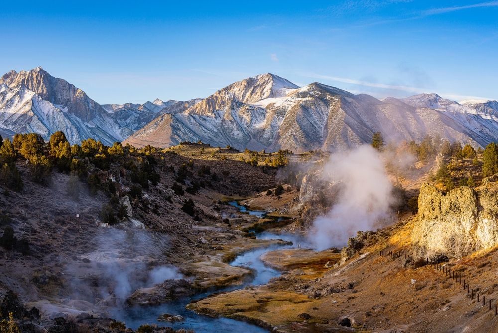 Das Highlight ist Hot Creek selbst! Das dampfende türkisfarbene Wasser fließt entlang des Bachbettes und erzeugt einen faszinierenden Anblick. Während das Schwimmen im Bach nicht erlaubt ist, bieten ausgewiesene Einweihbereiche weiter stromabwärts (außerhalb des Weges) die Möglichkeit, das warme Mineralwasser zu erleben.