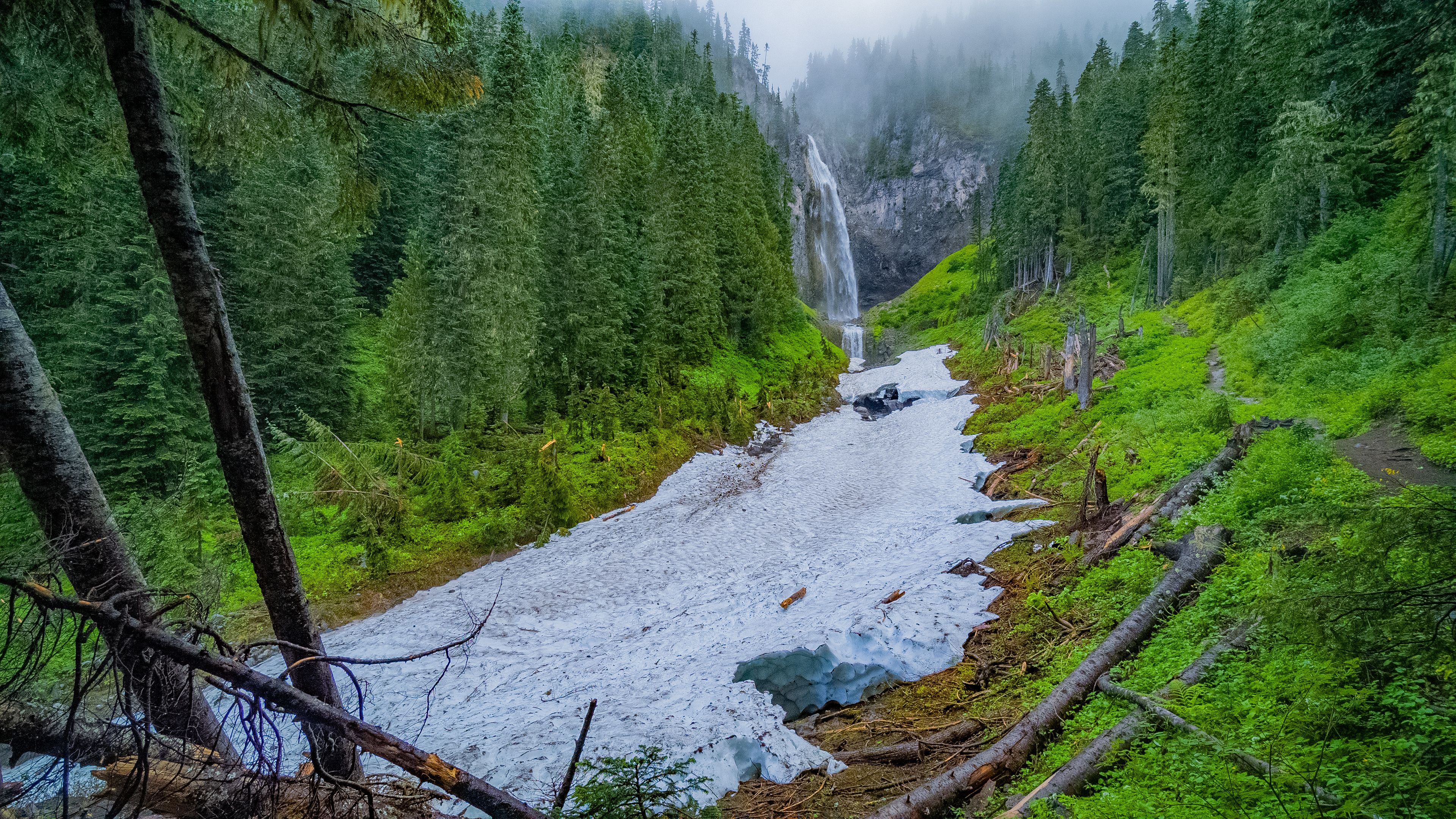 Der Van Trump Trail zu den Comet Falls ist eine steile und anstrengende Reise durch üppige Wälder und Felsvorsprünge. Vom Ausgangspunkt aus geht es schnell bergauf, wobei eine Reihe von Serpentinen Ihre Ausdauer auf die Probe stellen.