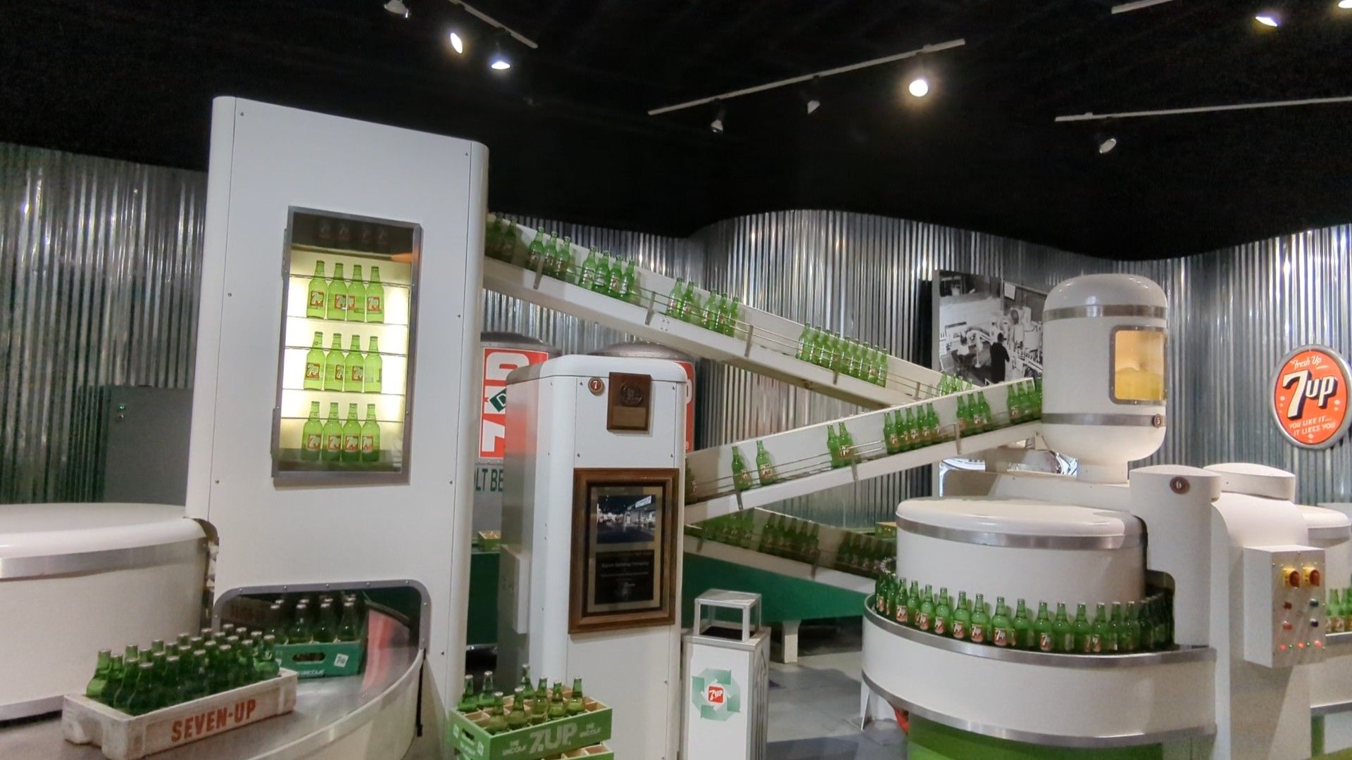 Aktive Demonstration einer 7UP-Fertigungslinie im Dr. Pepper Museum in Waco, Texas