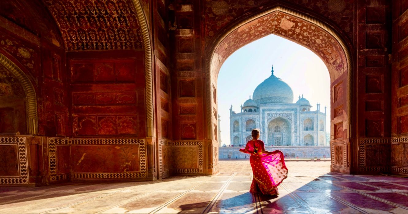 Frau im roten Sari/Sari im Taj Mahal, Agra, Uttar Pradesh, Indien