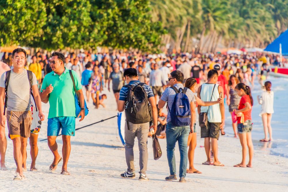 Menschenmassen am White Beach auf der Insel Boracay, Philippinen