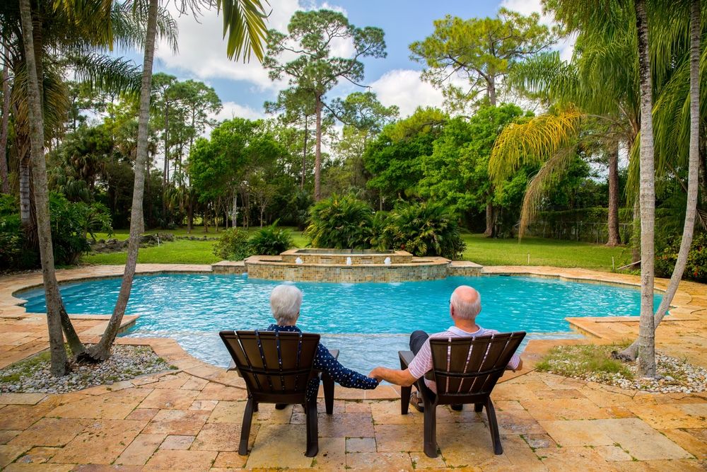Ein älteres Paar hält Händchen, während es an einem Pool in Miami, Florida, FL, USA sitzt