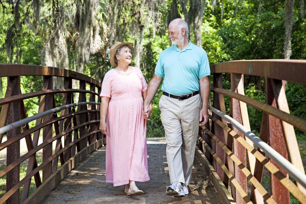 Ein entzückendes älteres Seniorenpaar genießt seinen Ruhestand und macht einen Spaziergang in einem Park in Florida