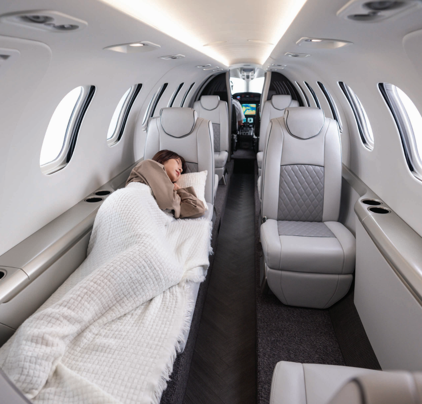 Im Vergleich zu anderen Leichtflugzeugen bietet der HondaJet 2600 für ein Flugzeug dieser Größe außergewöhnlichen Flugkomfort. Der Jet verfügt über eine Kabine mit einer Höhe von etwa 5,2 Fuß und einer Breite von 5,08 Fuß und bietet eine Länge von 25,38 Fuß für Passagiersitze, die in mehreren Konfigurationen angeordnet werden können. Es können bis zu 11 Passagiere untergebracht werden, obwohl andere Konfigurationen möglicherweise über ein umwandelbares Bett verfügen. Diese Anordnung bietet außerdem einen Abstand von sieben Fuß zwischen den gegenüberliegenden Sitzen im Flugzeug und bietet den Passagieren ausreichend Beinfreiheit und ausgedehnte Liegemöglichkeiten.