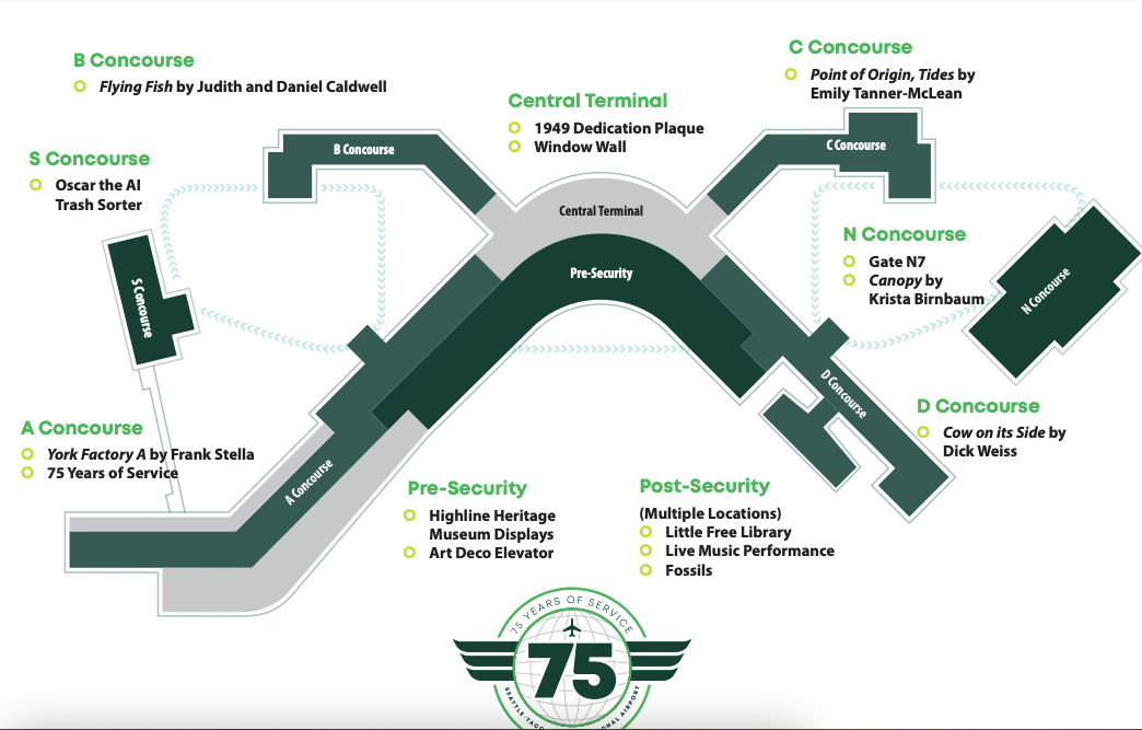 Zur Feier seines Jubiläums hat der SEA Airport ein neues unterhaltsames Spiel eingeführt: die Schnitzeljagd zum 75-jährigen Jubiläum. Der Flughafen hat eine Karte erstellt, die seine beliebtesten und historischen Orte hervorhebt. Sie können diese Orte mithilfe der Karte auf Ihrem Telefon verfolgen und lokalisieren oder am Informationsschalter in der A-Halle nach einer gedruckten Kopie fragen. Nachfolgend finden Sie die ausgewählten Flughafenorte und Hinweise: