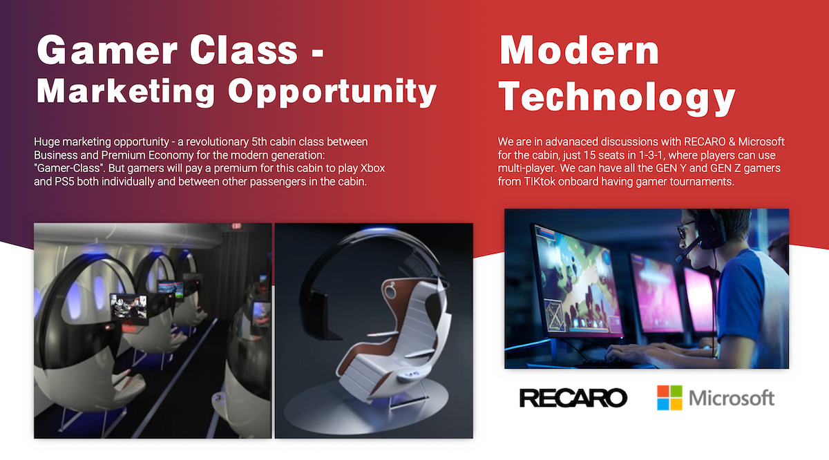 Wie von bemerktEine Meile nach der anderenIm Jahr 2022 befanden sich zunächst fünf Klassen an Bord des Flugzeugs. Frühe Konzepte sahen vier 50 Zoll breite, vollständig geschlossene Suiten vor, jede mit einer privaten Toilette. Neben der Business Class, Premium Economy und Economy Class sollte es eine 5. Kabine namens „Gamer Class“ geben. Dies hätte es den Passagieren ermöglicht, einen Aufpreis zu zahlen, um „Xbox und PS5 sowohl einzeln als auch zwischen anderen Passagieren in der Kabine zu spielen“. Frühe Renderings zeigen futuristisch aussehende Kabinen mit Sitzplätzen, die denen der Langstrecken-Premium-Economy-Klasse ähneln. Diese Kapseln hätten große Fernsehbildschirme gehabt, die vor dem Passagier aufgehängt waren. In diesem alten Marketingmaterial hieß es: „Wir befinden uns in fortgeschrittenen Gesprächen mit RECARO und Microsoft für die Kabine, nur 15 Sitzplätze im 1-3-1-Modus, in dem Spieler den Mehrspielermodus nutzen können.“