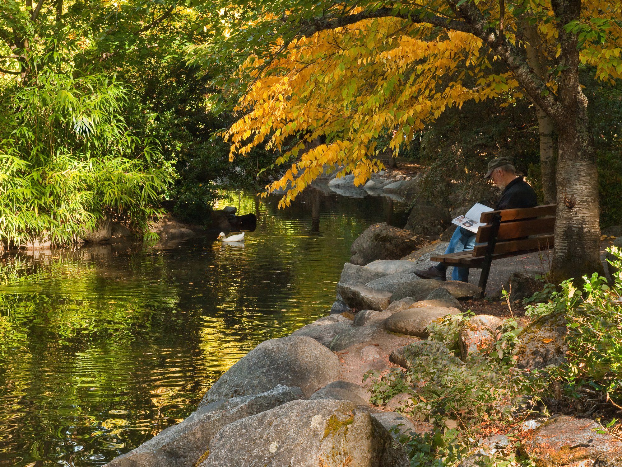 Ein Mann sitzt auf einer Bank im Lithia Park in Ashland, Oregon, auf einer Bank