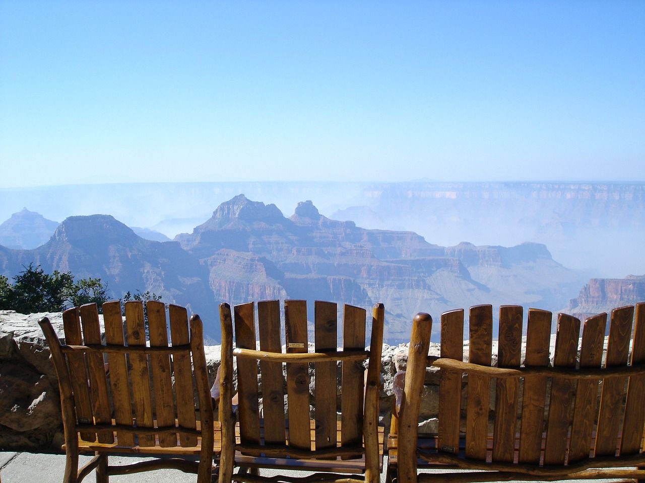 In der North Rim Lodge gibt es Stühle mit Blick auf den dahinter liegenden Canyon