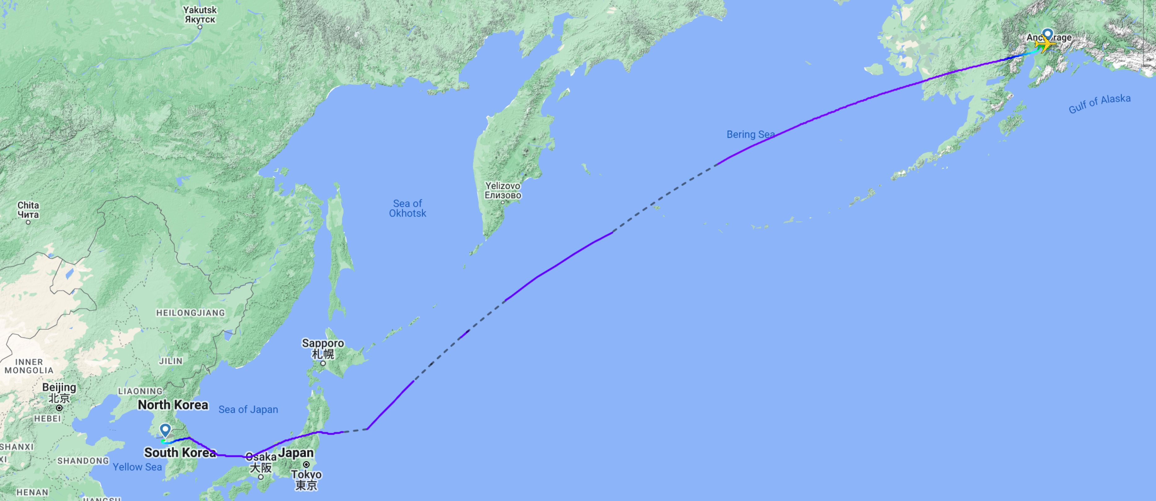 Der Atlas Air 747-8F betrieben einen Flug von Seoul, Südkorea, nach Anchorage als letzte Etappe eines Drei-Wege-Ankerplatzes-Chengdu (China)-Seoul-Anchorage-Rotation. Dieser letzte Sektor verließ den Seoul Incheon International Airport (ICN) am Mittwoch, den 24. Januar, um 17:00 Uhr Ortszeit und landete nach einem Flug von 7:35 Uhr schließlich um 06:35 Uhr Ted Stevens International.