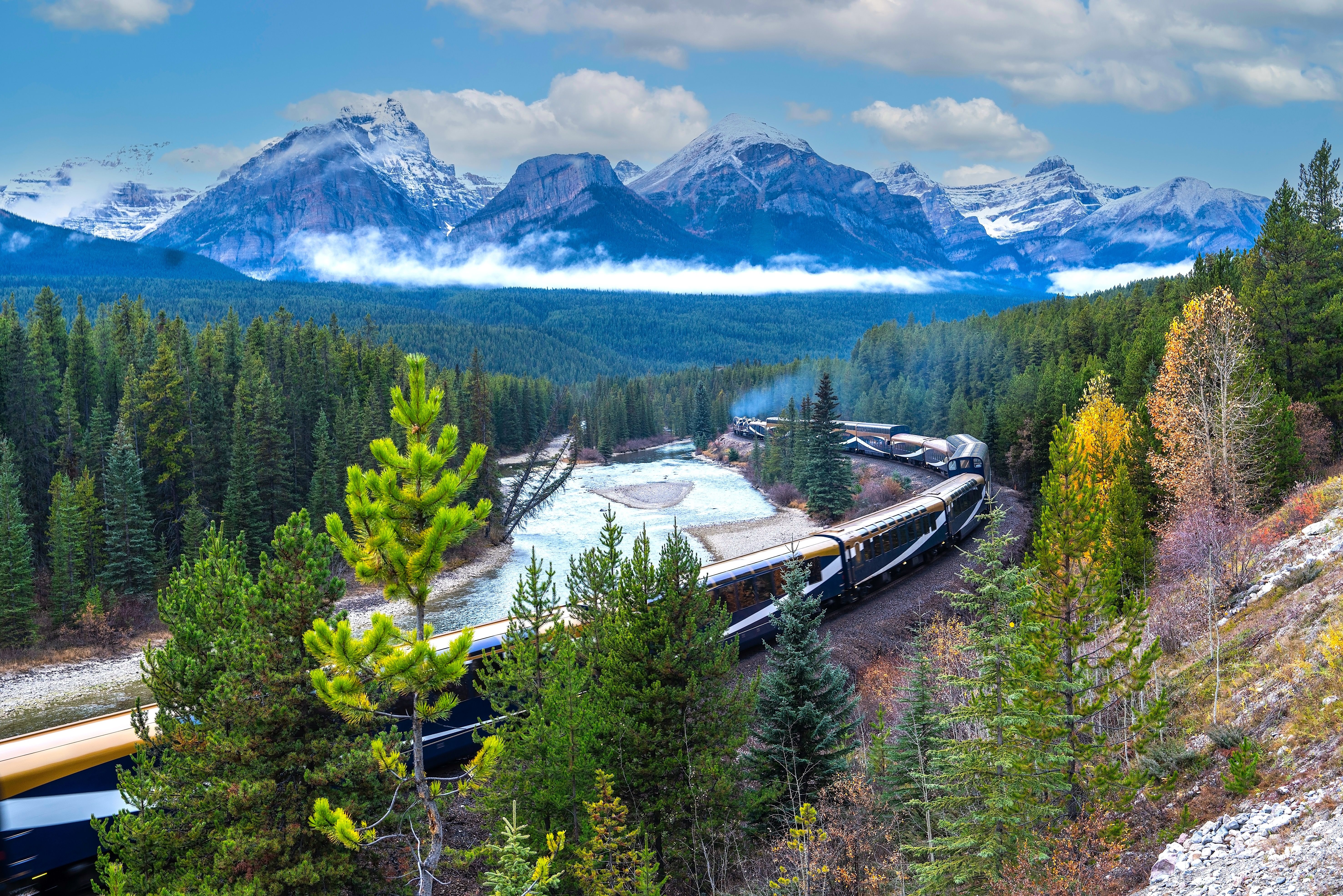 Der Rocky Mountaineer bewegt sich entlang des Bow River in den kanadischen Rocky Mountains, Banff-Nationalpark.