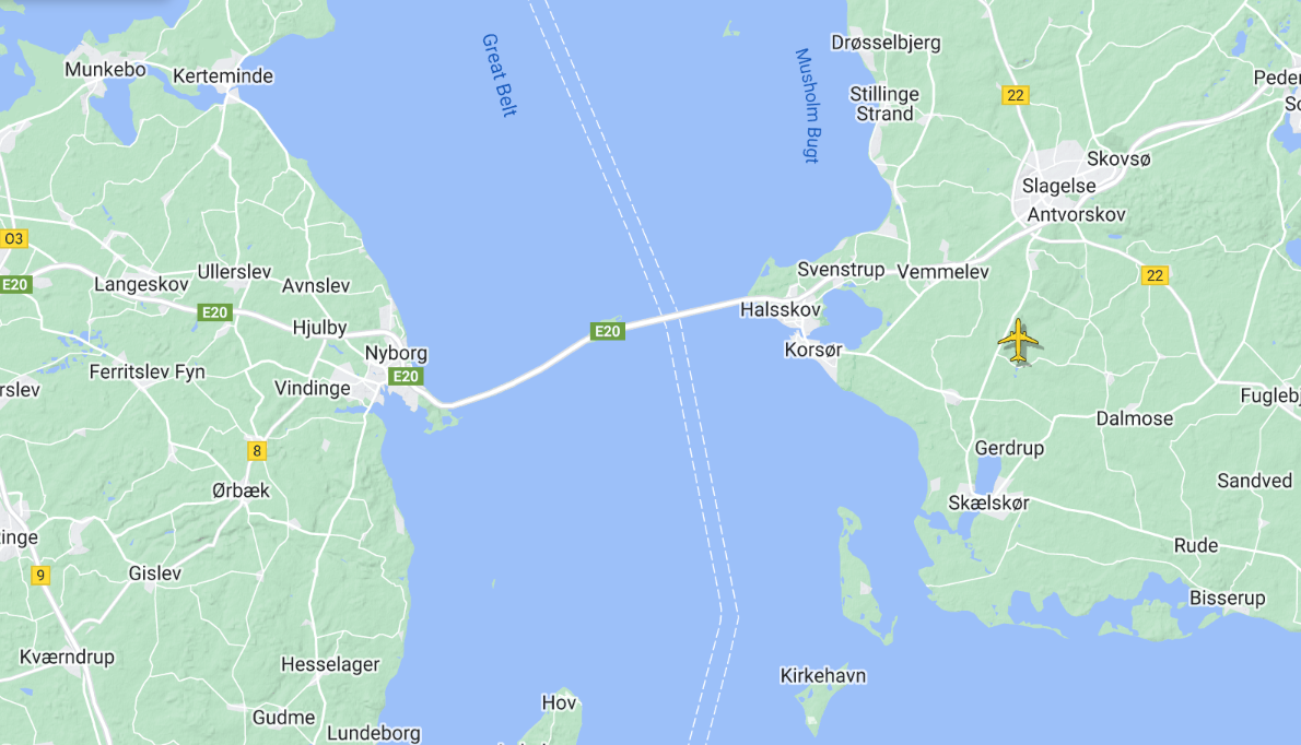 Ein Blick auf die Flugverfolgungs-Website Flightradar24 zeigt, dass Verkehrsflugzeuge dem Gebiet ausweichen. Korsør liegt etwa 4 km südlich der Brücke über den Großen Belt, die den Straßenverkehr zwischen den dänischen Inseln Seeland und Fünen abwickelt – diese Brücke ist weiterhin für den Verkehr geöffnet, da sie nicht in den Gefahrenbereich fällt.