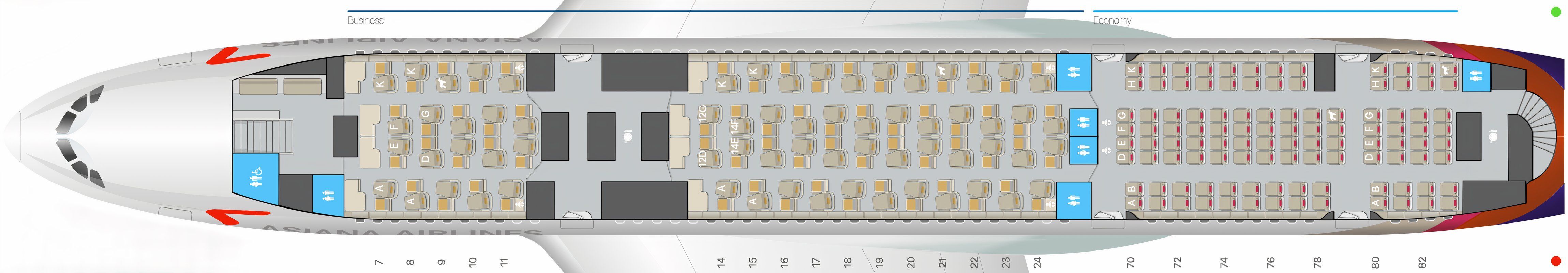 Asiana Airlines betreibt derzeit sechs A380. Sollte jedoch später in diesem Jahr die Fusion mit Korean Airlines genehmigt werden, werden beide Fluggesellschaften diesen Typ voraussichtlich im Jahr 2026 im Rahmen ihrer Flottenoptimierung aus dem Verkehr ziehen. Bis dahin bietet Asiana eine Economy-Class-Kabine auf dem Oberdeck mit 104 Sitzplätzen in einer 2-4-2-Konfiguration an. Die Kabine befindet sich im hinteren Teil des Oberdecks, hinter den beiden Business-Class-Kabinen.
