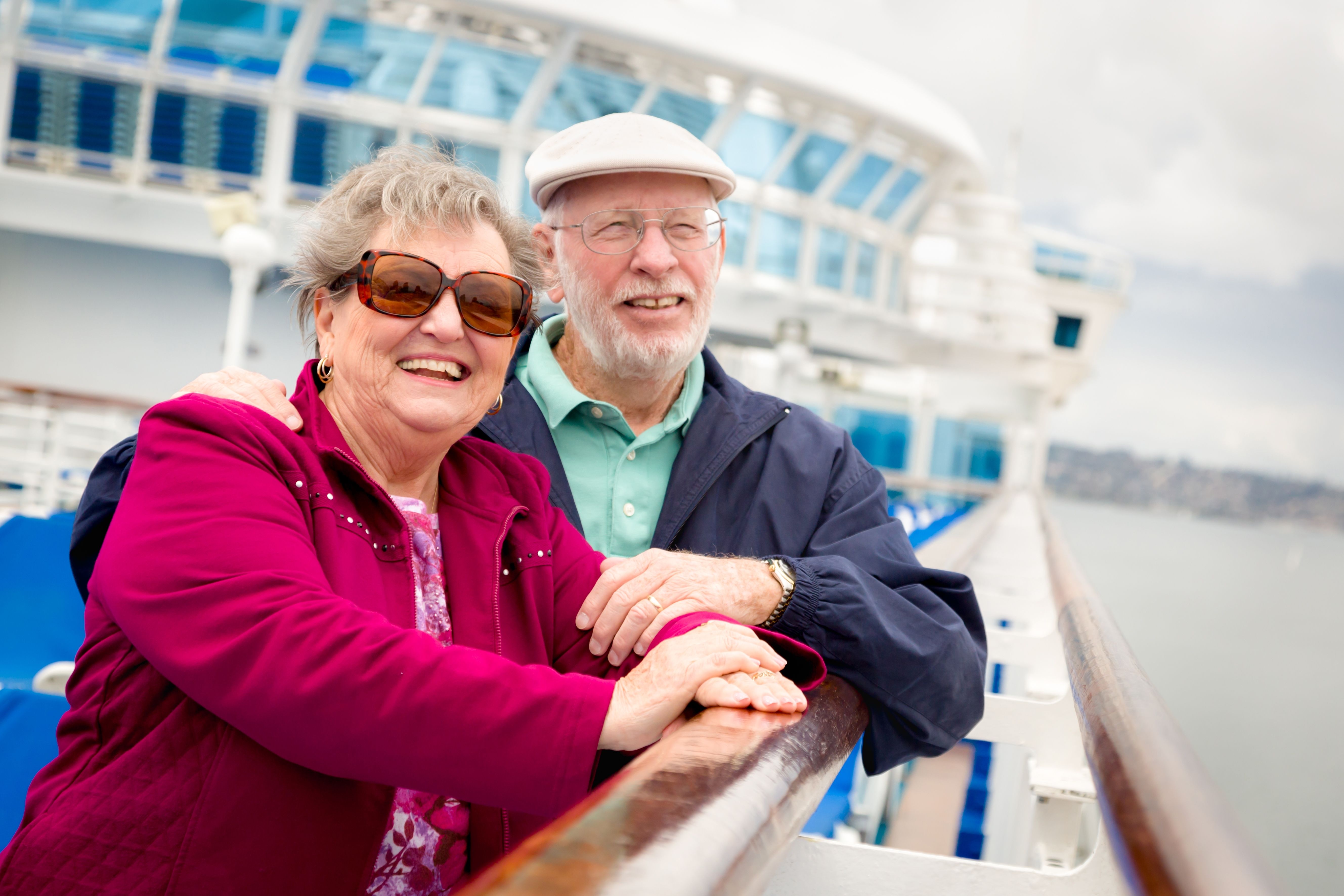 Ein älteres Paar genießt die Aussicht von einem Passagierkreuzfahrtschiff aus.