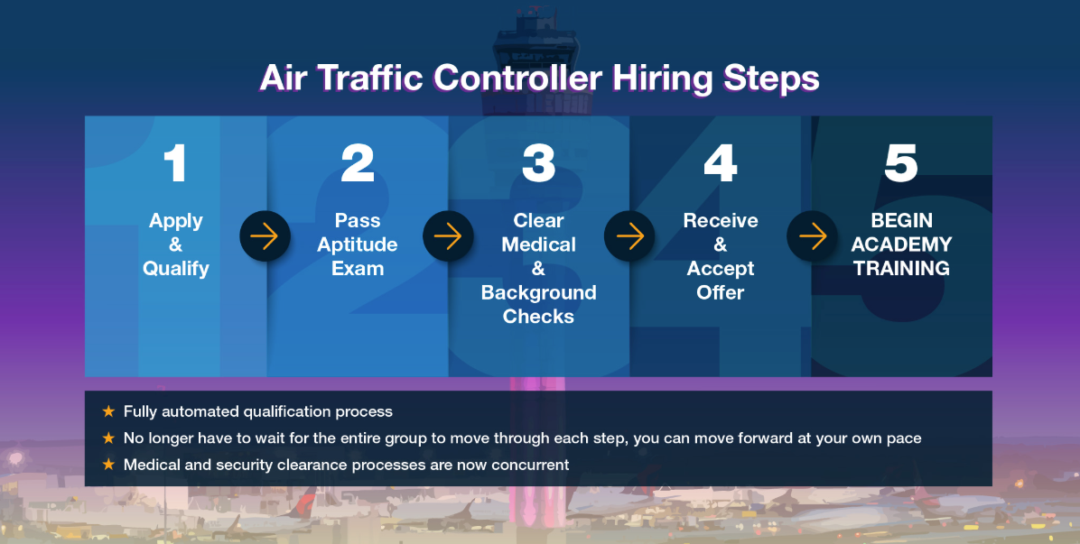 Wie oben dargestellt, ist die Einstellung als ATCS-Auszubildender ein langwieriger Prozess mit fünf Schritten. Vor der Bewerbung müssen Einzelpersonen sicherstellen, dass sie die von der FAA genehmigten Richtlinien erfüllen. Zu den bemerkenswerten Richtlinien gehören eine ordnungsgemäße Veteranenüberprüfung, ein DOT-Drogen- und Alkoholtest und eine ärztliche Untersuchung durch einen zugelassenen Arzt. Sobald die vorherigen Aktionspunkte sortiert und ein Lebenslauf erstellt wurden, kann sich eine Person direkt auf der FAA-Website bewerben.