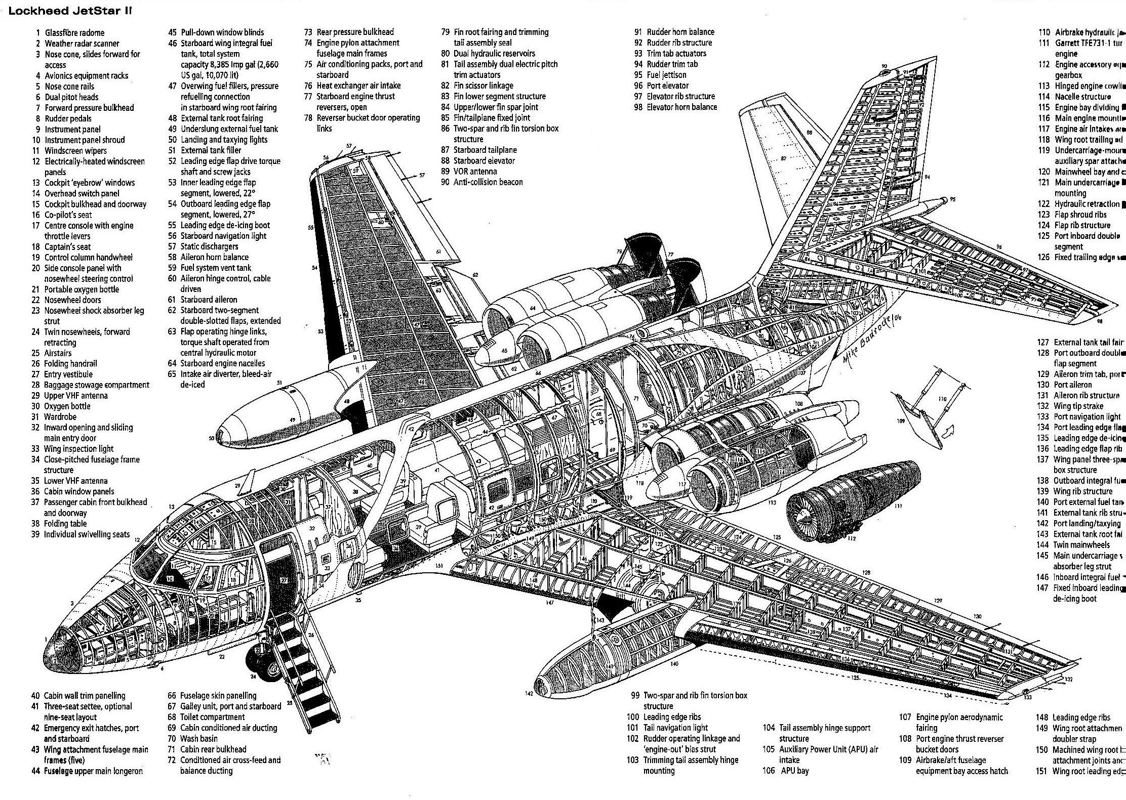 Das aufgeschnittene Jetstar-Diagramm zeigt die Standardversion mit 10 Sitzplätzen. Die militarisierte VIP-Version – VC-140B – war für nur acht Passagiere konfiguriert. Beachten Sie den kompakten Innenraum, der auf Transport und nicht auf Luxuskomfort ausgerichtet ist. Für den zufälligen Betrachter mag der Mittelgang trivial erscheinen. Bei einem Rumpf mit kleinem Durchmesser, wie etwa bei einem Geschäftsflugzeug, sind Passagiere normalerweise nicht in der Lage, aufrecht zu stehen. Sich in einem Businessjet bücken zu müssen, um sich fortzubewegen, wirkt nicht sehr VIP-mäßig. Durch die Konfiguration des Flugzeugs mit einem „versunkenen“ Mittelgang entfällt die Notwendigkeit, sich zu bücken.