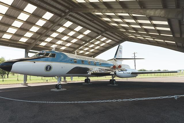 Unten ist Präsident Johnsons USAF VC-140B Lockheed Jetstar auf der LBJ Ranch und dem Museum des National Park Service in Stonewall, TX zu sehen. Als der Präsident nach Hause zu seiner Ranch fliegen wollte, mied er lieber die größere Boeing VC-135 (basierend auf der Boeing 707), da diese nicht auf der privaten Landebahn der Ranch landen konnte. Der Jetstar wurde scherzhaft als „Air Force One-Half“ bezeichnet!