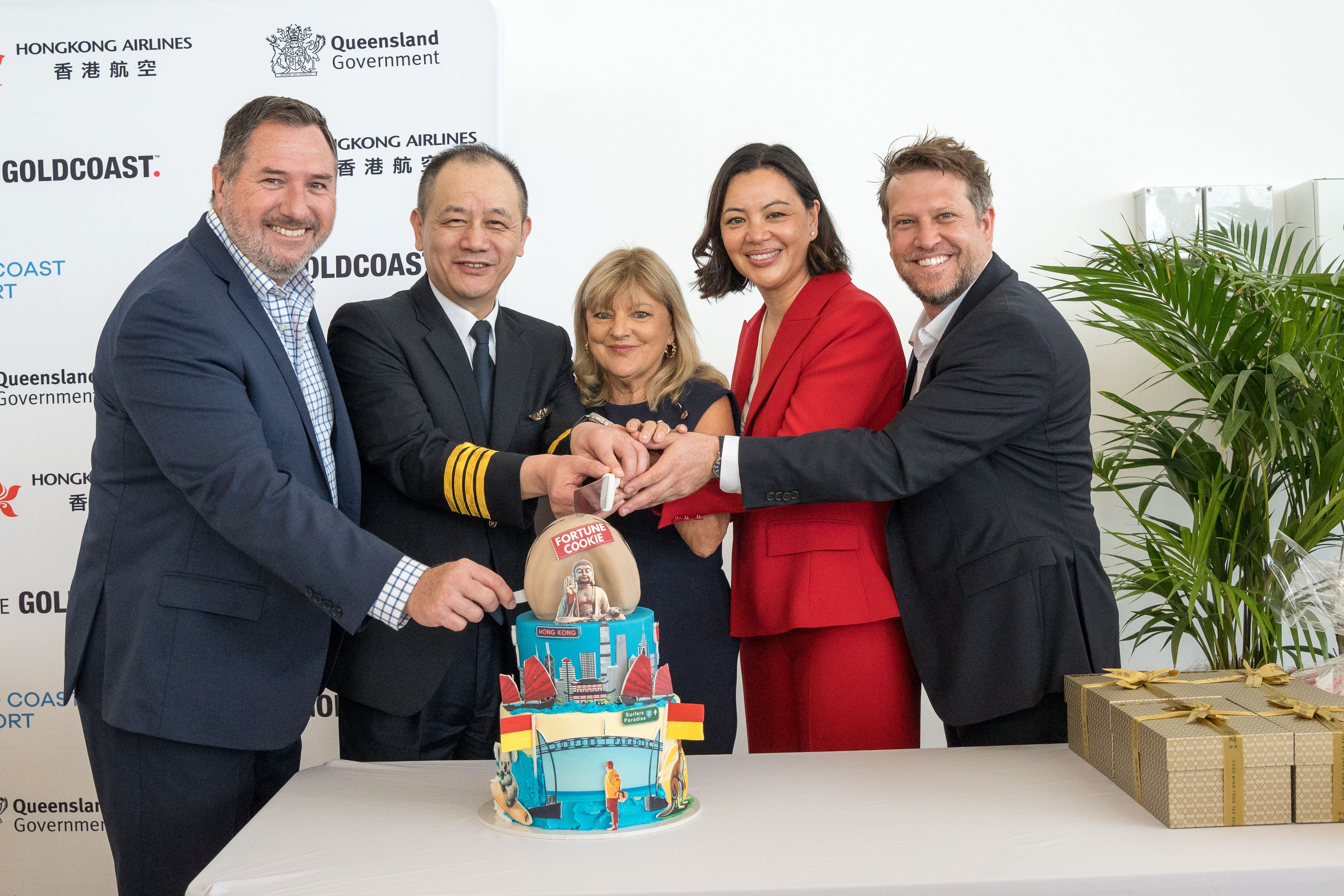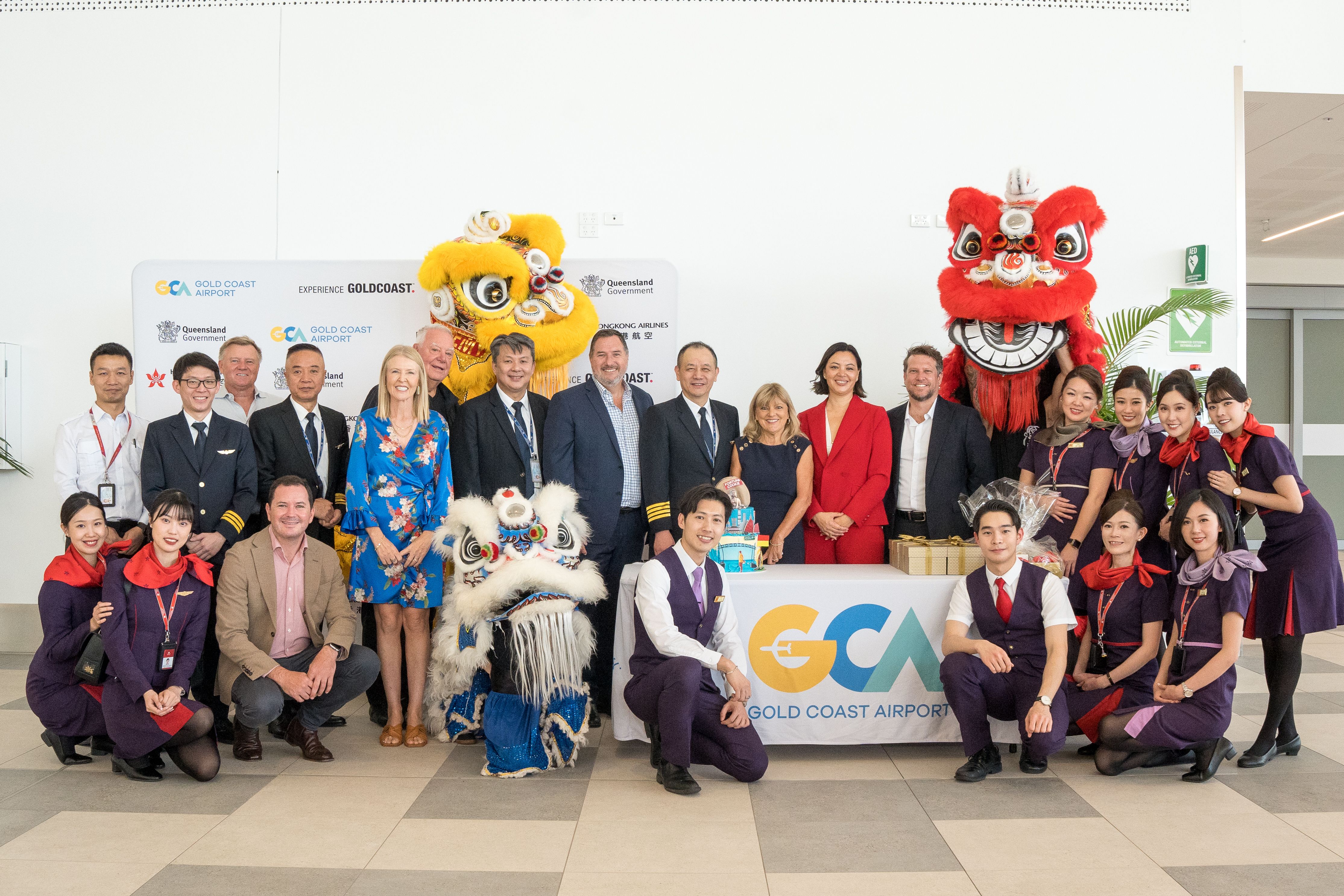 Passagiere bei der EröffnungHong Kong AirlinesDie Gottesdienste wurden zweimal mit farbenfrohen Feierlichkeiten belohnt – einmal beim Einsteigen in Hongkong und noch einmal bei der Ankunft in AustralienFlughafen Gold Coast(OOL). Der wieder aufgenommene Dienst wird viermal wöchentlich montags, mittwochs, freitags und sonntags von Hongkong aus durchgeführt, mit Rückflügen von der Goldküste am folgenden Tag.