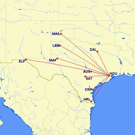 Die Fluggesellschaft bedient von Houston aus auch den Midland International Air & Space Port (MAF), der die Region Midland-Odessa bedient, mit durchschnittlich mehr als dreimal täglichen Flügen. Die Fluggesellschaft bietet außerdem mehr als dreimal täglich Nonstop-Flüge von Houston zum Harlingen’s Valley International Airport (HRL) an, mit insgesamt 100 Flügen im Januar. Zu den verkehrsreichsten Nonstop-Flügen der Fluggesellschaft von Houston gehören Dallas und San Antonio, die beide mehr als sieben Mal täglich durchgeführt werden.