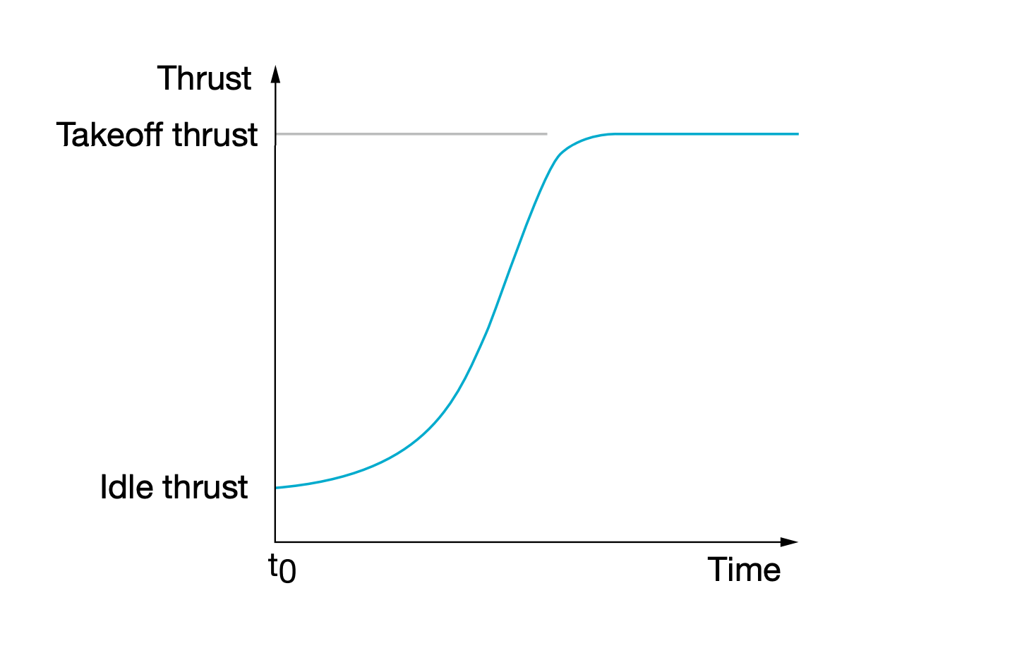 Diese Verringerung des Schubs zu Beginn des Starts ist in der folgenden Grafik zu sehen. Es wird der Schub gegen die Zeit aufgetragen. Wenn die Schubhebel bewegt werden, bleibt der Triebwerksschub für einige Momente nahezu konstant. Dies wird dadurch verursacht, dass sich die Entlüftungsöffnungen des Kompressors öffnen.