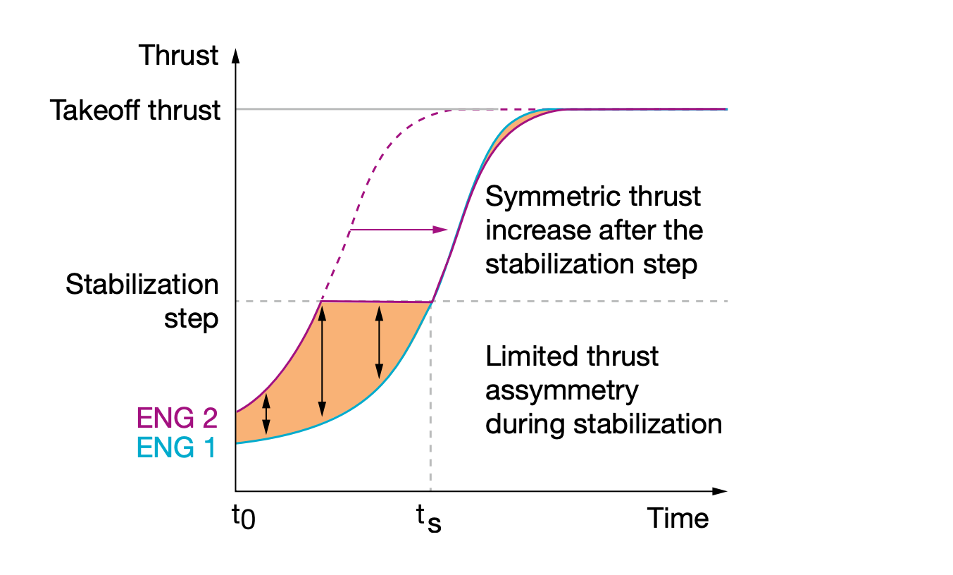 Um eine solche Schubasymmetrie zu vermeiden, müssen die Piloten die Triebwerke zunächst auf eine mittlere Schubeinstellung bringen. Sobald sich die Triebwerke in dieser Einstellung stabilisiert haben, sollte der volle Schub ausgeübt werden. Der einzustellende Zwischenschub ist von Flugzeug zu Flugzeug unterschiedlich und kann dem Flughandbuch entnommen werden. Beispielsweise müssen die CFM 56-Triebwerke zunächst auf 50 % eingestellt und auf 50 % stabilisiert werden, bevor der volle Schub für den Start zur Verfügung steht. Es handelt sich also um einen zweistufigen Prozess.