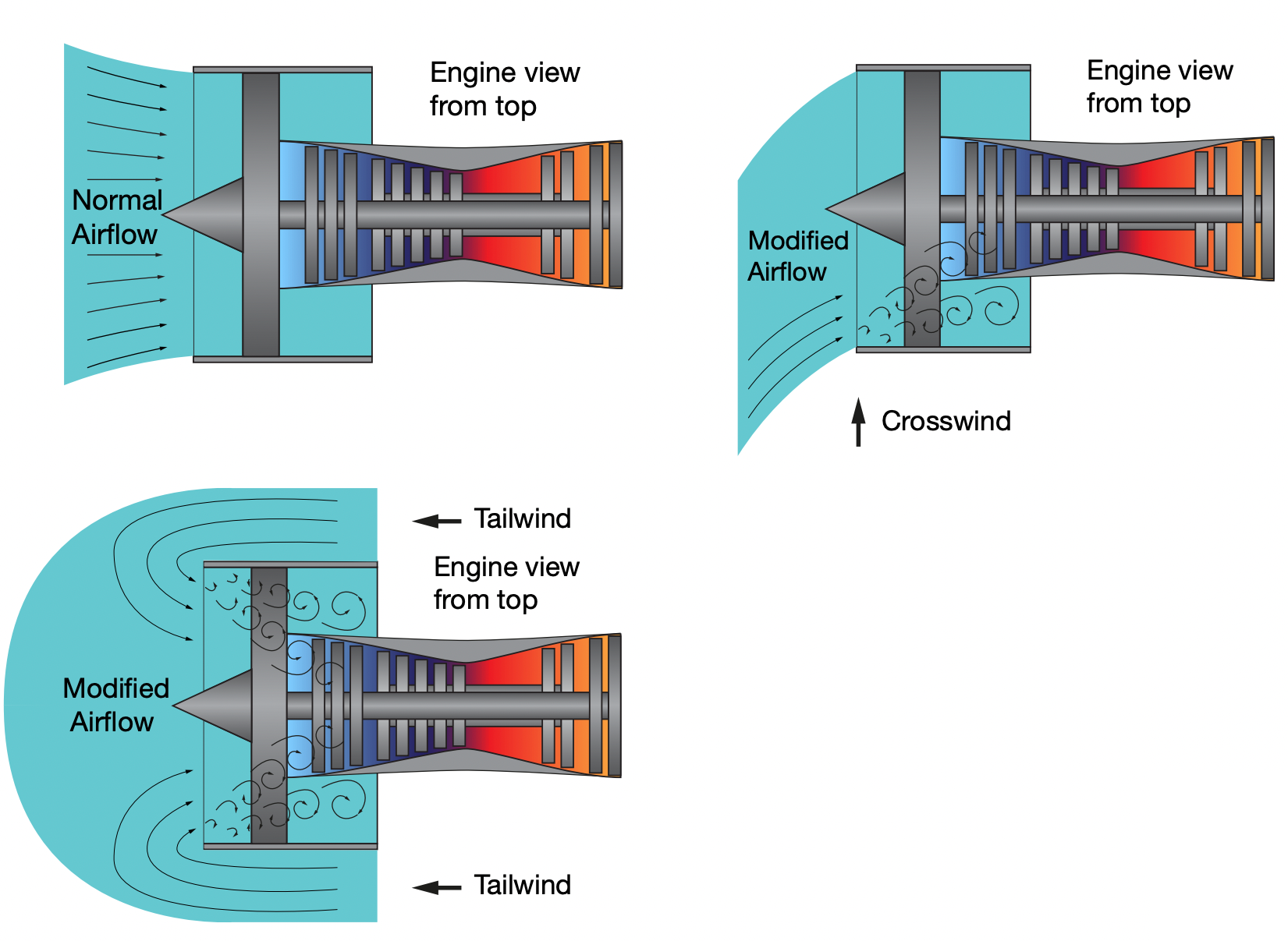 Starke Seiten- und Rückenwinde können den Luftstrom durch die Triebwerke stören. Da ein falscher Luftstrom zum Abwürgen des Kompressors führen kann, sind einige zusätzliche Maßnahmen erforderlich.