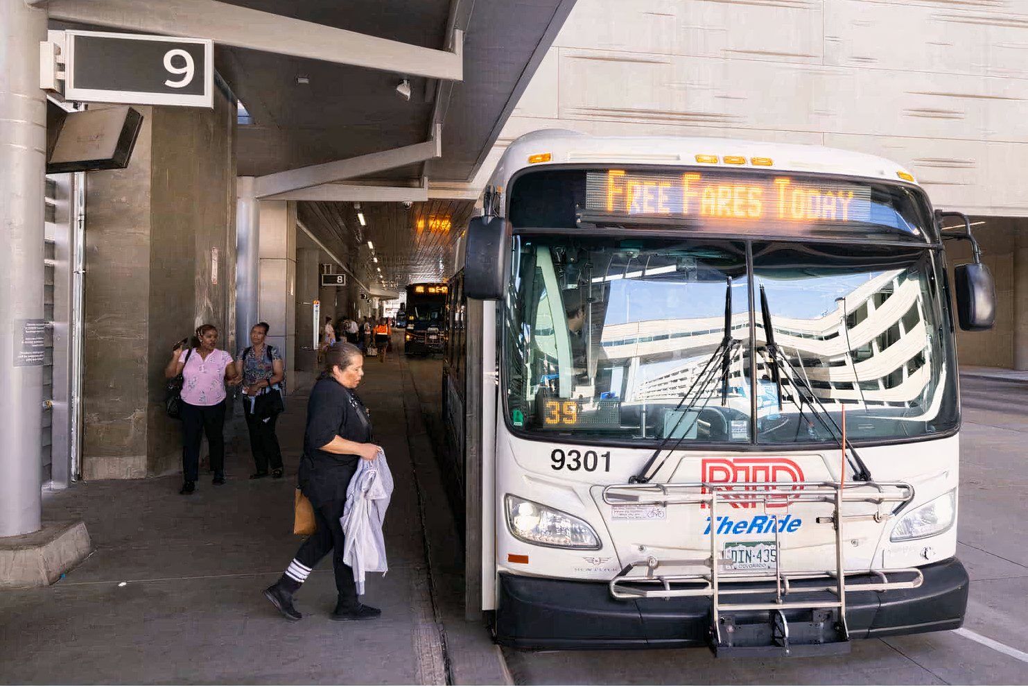 Zusätzlich zum Nahverkehrszug der A-Linie können Fahrgäste im Transit Center auf die SkyRide RTD-Busse zugreifen, darunter die Dienste AF (Downtown), AB (Boulder) und AT (Arapahoe County) sowie die lokalen Dienste 104L, 145X und 169L. Die Busse fahren etwa alle 15 Minuten ab, die letzte Verbindung ist um 01:30 Uhr.