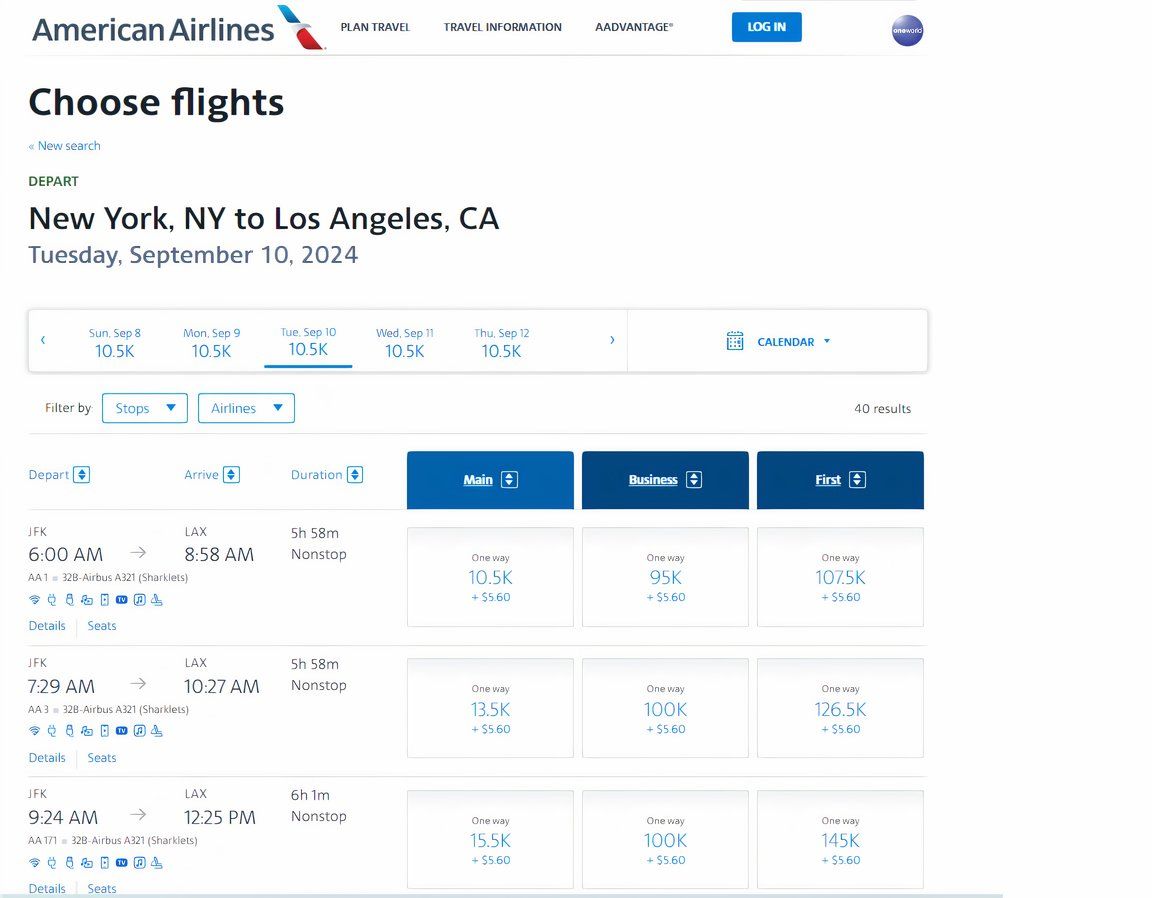Betrachten Sie als Beispiel eine Meileneinlösung bei American Airlines AAdvantage. Wie in den Bildern unten gezeigt, ergibt eine einfache Suche nach einem einfachen Flug zwischen New York JFK und Los Angeles LAX etwa drei Monate im Voraus die folgenden Tarife: