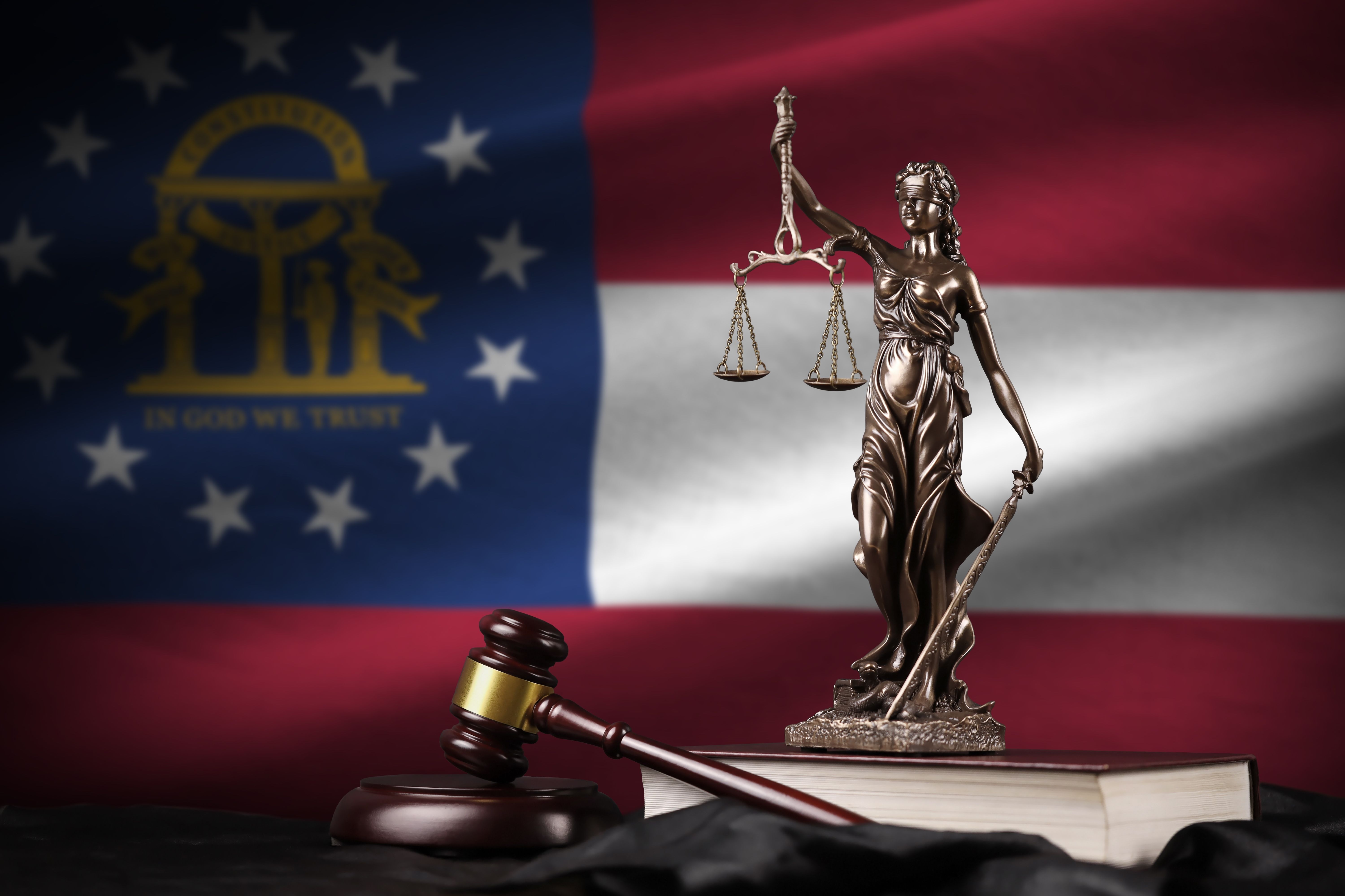 Georgia US-Staatsflagge mit Statue der Justitia, Verfassung und Richterhammer auf schwarzem Vorhang.