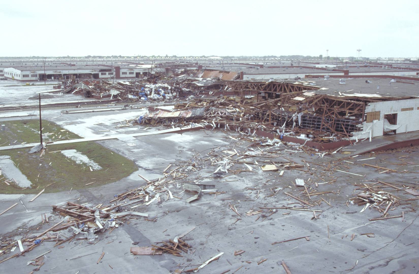 Durch Hurrikan Gilbert zerstörte Lagerhäuser im San Antonio Air Logistics Center, Texas, USAQuelle: TSGT Michael J. Haggerty, US Air Force über Wikimedia Commons
