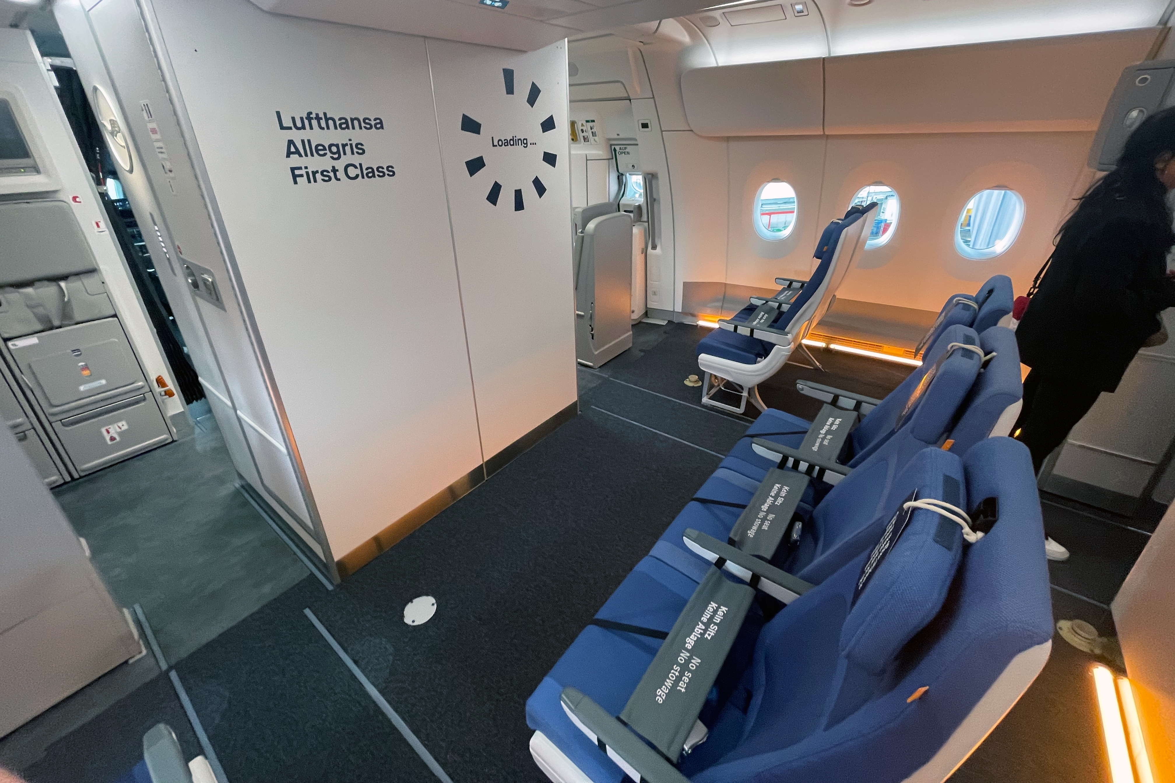 Als Simple Flying das Flugzeug Ende April besichtigte, verfügte die A350-900 über die neueste Langstrecken-Business-, Premium-Economy- und Economy-Class-Kabine der deutschen Fluggesellschaft. Die Kabine der ersten Klasse, in der die Suiten untergebracht werden sollten, wurde in verschiedenen Details angedeutet, wurde noch geladen.