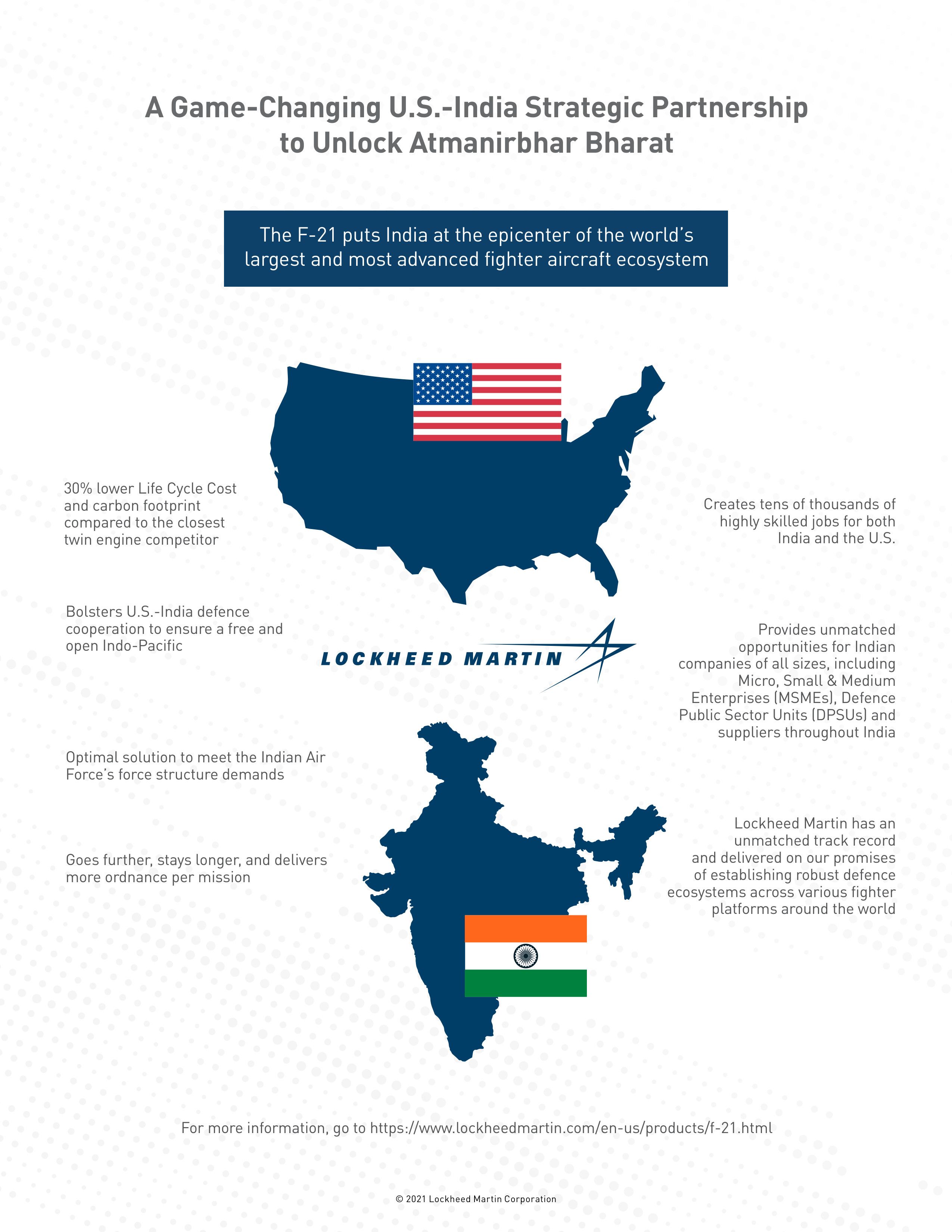 Die F-21 stammt aus der Familie der F-16 Fighting Falcon, einem Kampfflugzeug, das seit Jahrzehnten von vielen Luftstreitkräften auf der ganzen Welt geflogen wird. Dieses neue Modell zielt darauf ab, Avionik der fünften Generation, Sensorfusionstechnologien und offene Systemarchitekturen zu integrieren, um neuen betrieblichen Anforderungen gerecht zu werden. Die F-21 ist so konzipiert, dass sie für Indiens spezifisches taktisches und strategisches Einsatzgebiet geeignet ist. Dieser Vorschlag geht über die Einführung eines neuen Flugzeugs hinaus auf die Entwicklung eines Rahmens für die Stärke der Verteidigungsindustrie.