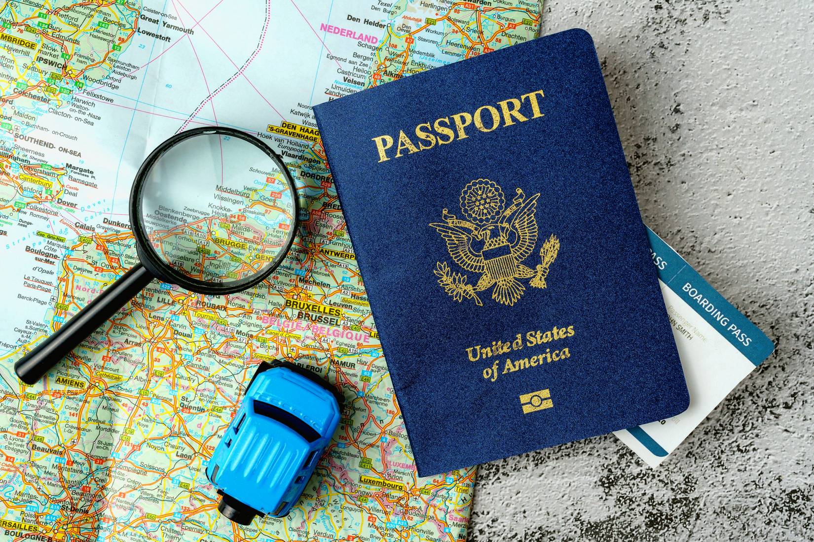 US-Pass auf einer Weltkarte und einer LupeBildnachweis: Shutterstock