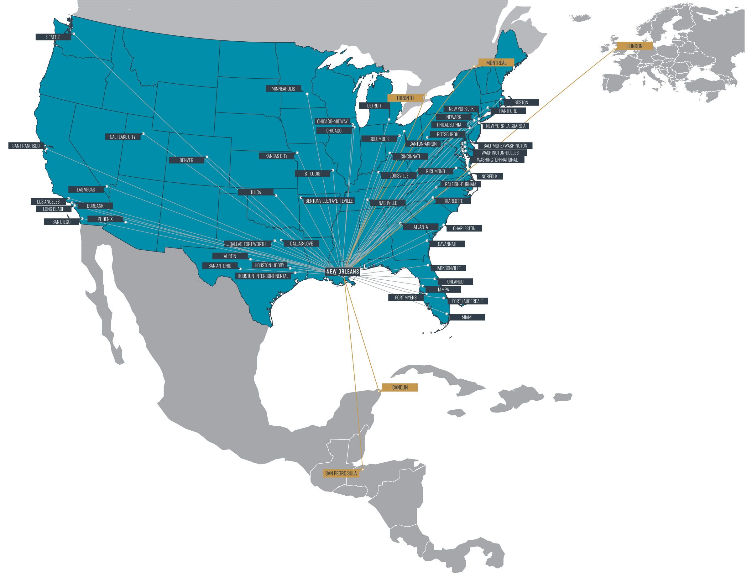 Im Februar gibt es insgesamt 50 Flughäfen mit Nonstop-Flügen nach MSY, obwohl mehrere Ziele von mehreren Flughäfen im selben Einzugsgebiet angeflogen werden. Das am häufigsten angeflogene Ziel ab New Orleans ist der Hartsfield-Jackson Atlanta International Airport mit fast 400 Flügen in jede Richtung in diesem Monat. Der größte Betreiber auf der 425 Meilen langen Verbindung ist natürlich Delta Air Lines, die auf der Strecke mit Frontier Airlines, Spirit Airlines und Southwest Airlines konkurriert.