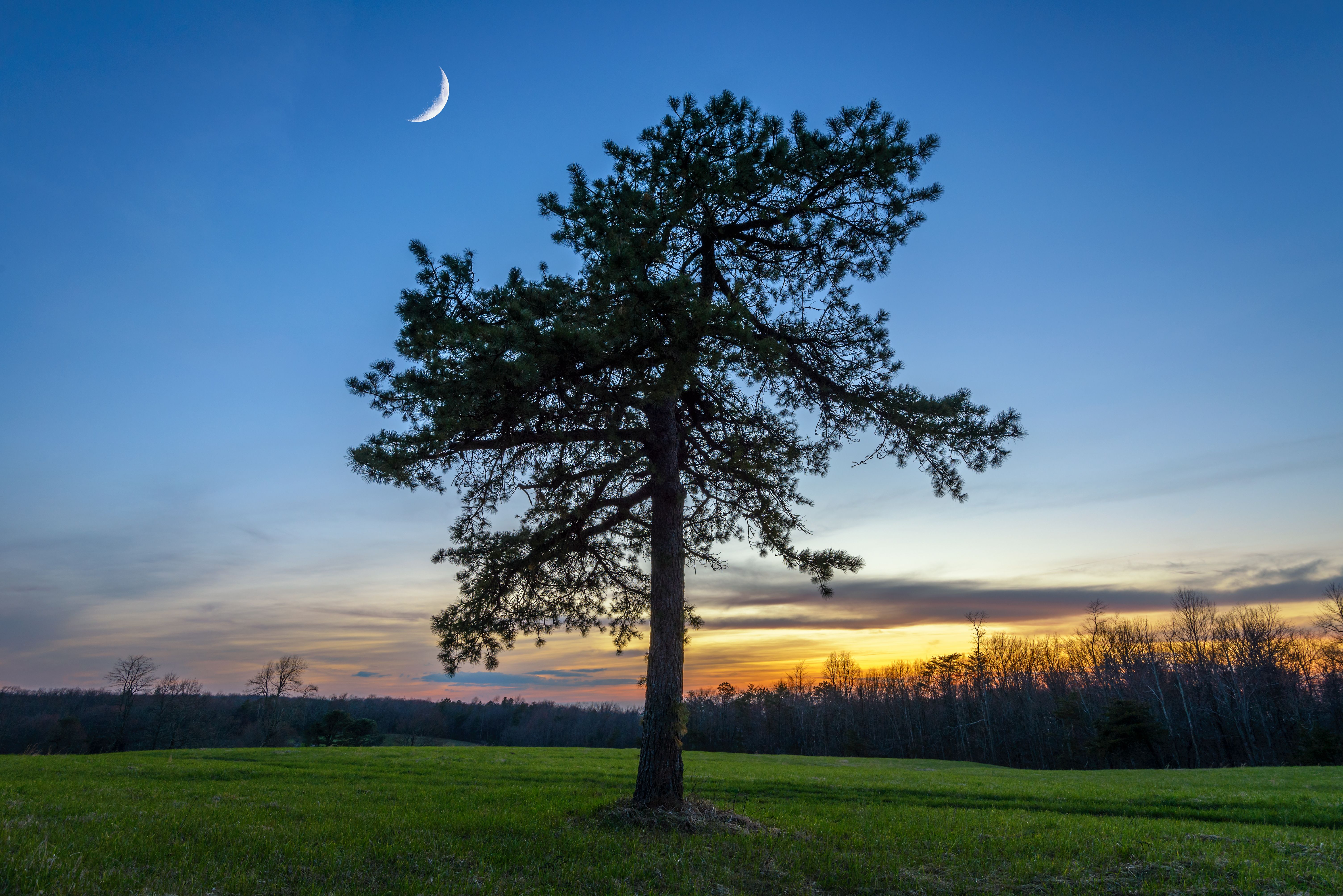 Eine einsame Kiefer und Halbmond in der Dämmerung von Hensley Settlement im Cumberland Gap National Park