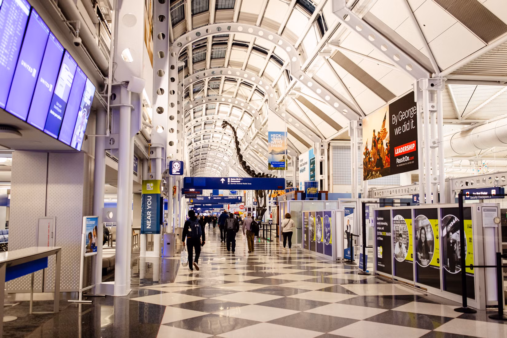 Der farbige elektrische Neontunnel „The Sky Is the Limit“ am Chicago O'Hare International Airport (ORD) verbindet die B- und C-Halle am United Airlines (UA)-Terminal. Bildnachweis: Shutterstock