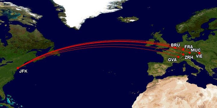 Der Lufthansa-Flug nach JFK nutzt Airbus A340-300 oder Boeing 747-400 nach Frankfurt und einen A380-800 nach München. SWISS setzt mittlerweile sowohl A330-300 von GVA als auch ZRH ein, während Austrian seine brandneuen 787-9 Dreamliner einsetzt. Brussels Airlines nutzt ihren einzigen Langstreckenflugzeugtyp, nämlich die A330-300.
