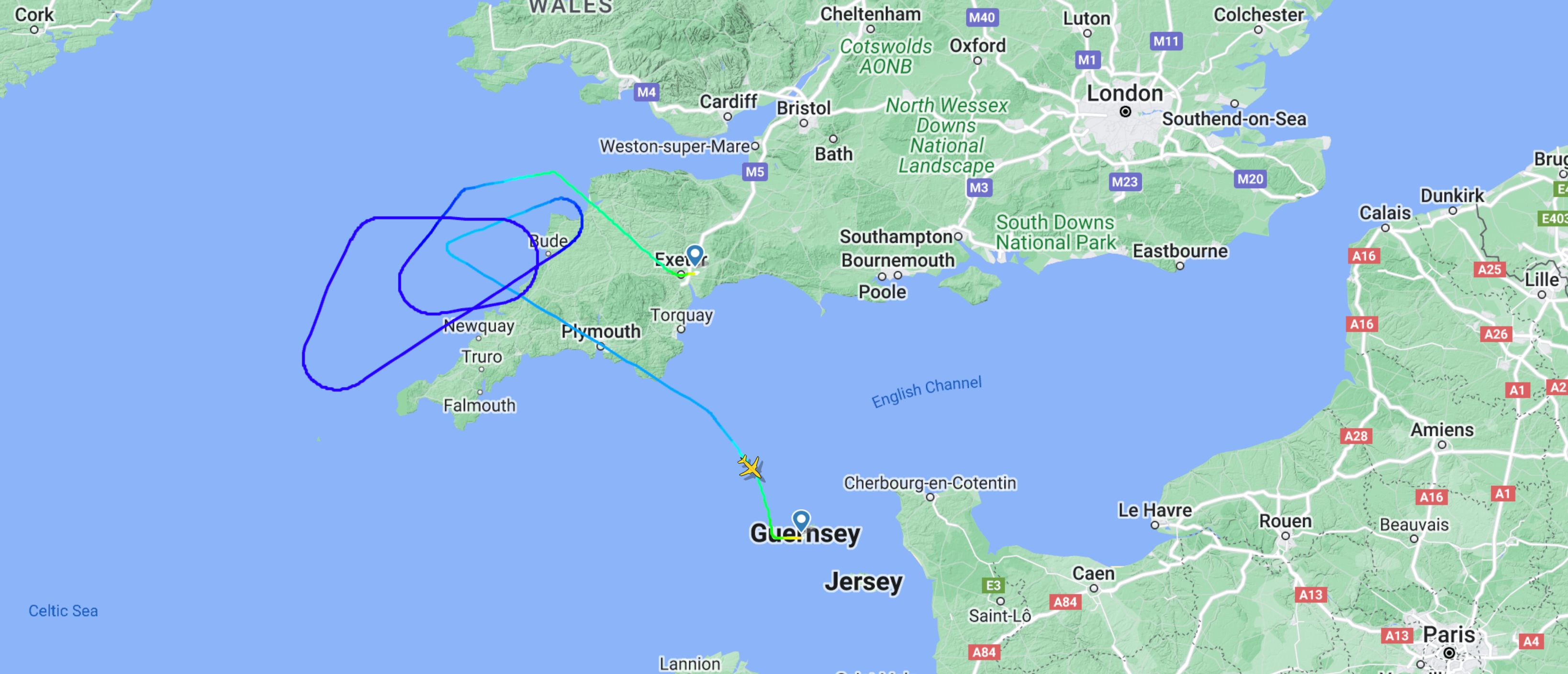 Der Embraer-Regionaljet von 2014 mit der Registrierung G-NSEY und MSN 19000671 sollte am 10. Juli nach Exeter zurückkehren, sein endgültiger Abflug verzögerte sich jedoch bis zum nächsten Tag, als er Guernsey um 15:20 Uhr verließ und um 15:49 Uhr ankam. Die Trackingdaten zeigen seitdem keine Bewegung, zumindest nicht unter dieser Registrierung.