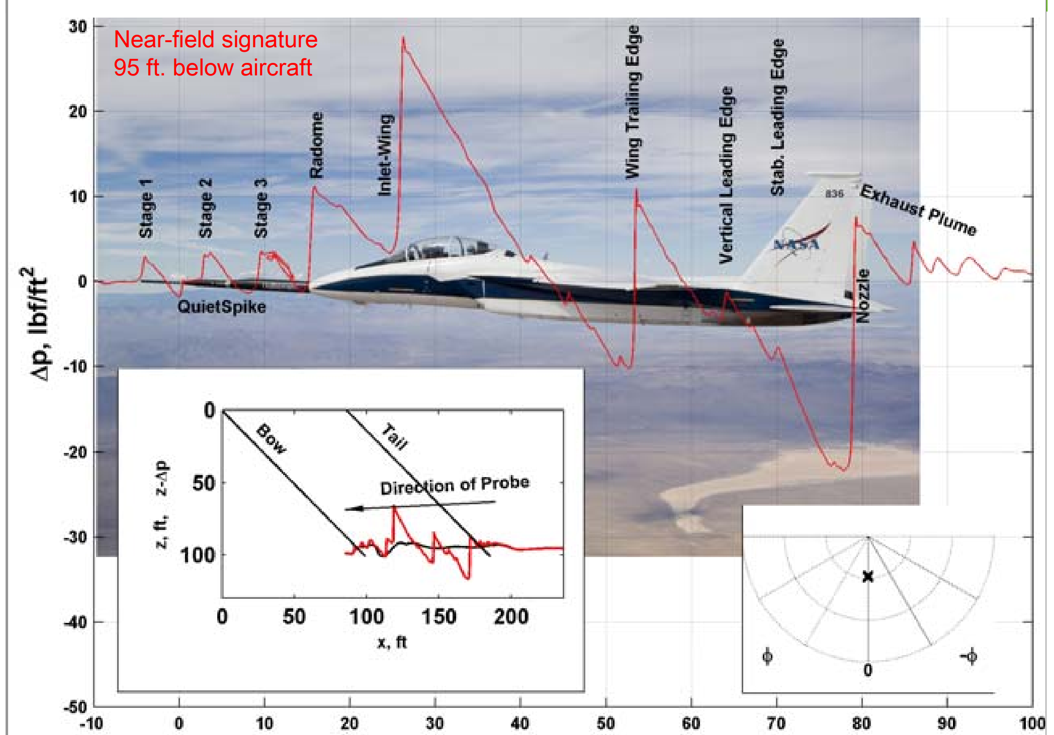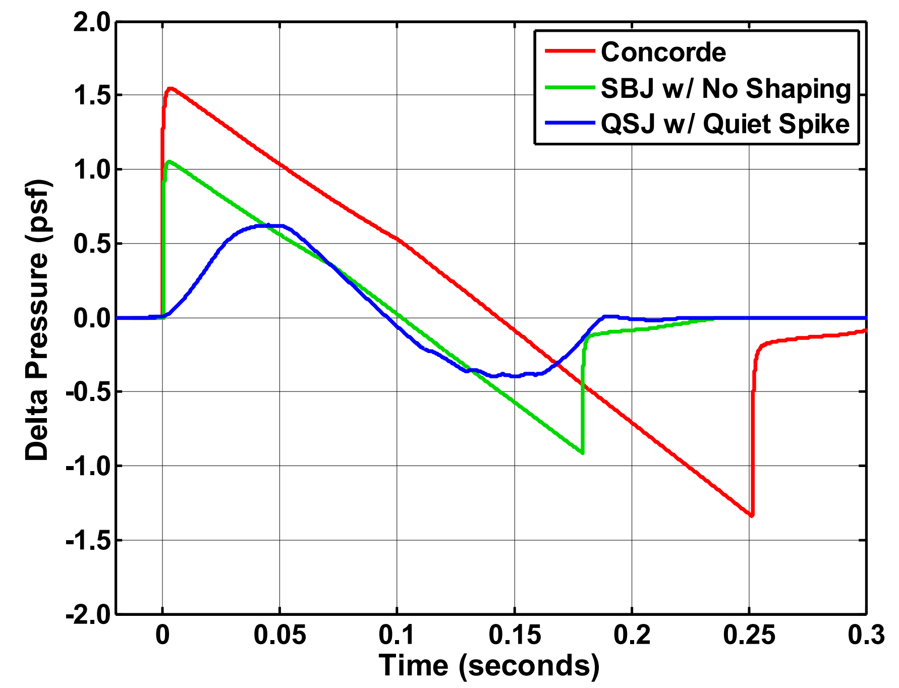 Die Federal Aviation Administration (FAA) verglich die Ergebnisse des Quiet Spike-Projekts (QSJ) mit den Drucktrends eines konventionellen Überschall-Businessjets (SBJ) und einer Concorde. Durch die Installation des Quiet Spike entsteht eine viel gleichmäßigere Druckwelle. Darüber hinaus ist die Wellenamplitude halb so groß wie bei einem Concorde-Flug, wie im Bild unten gezeigt.