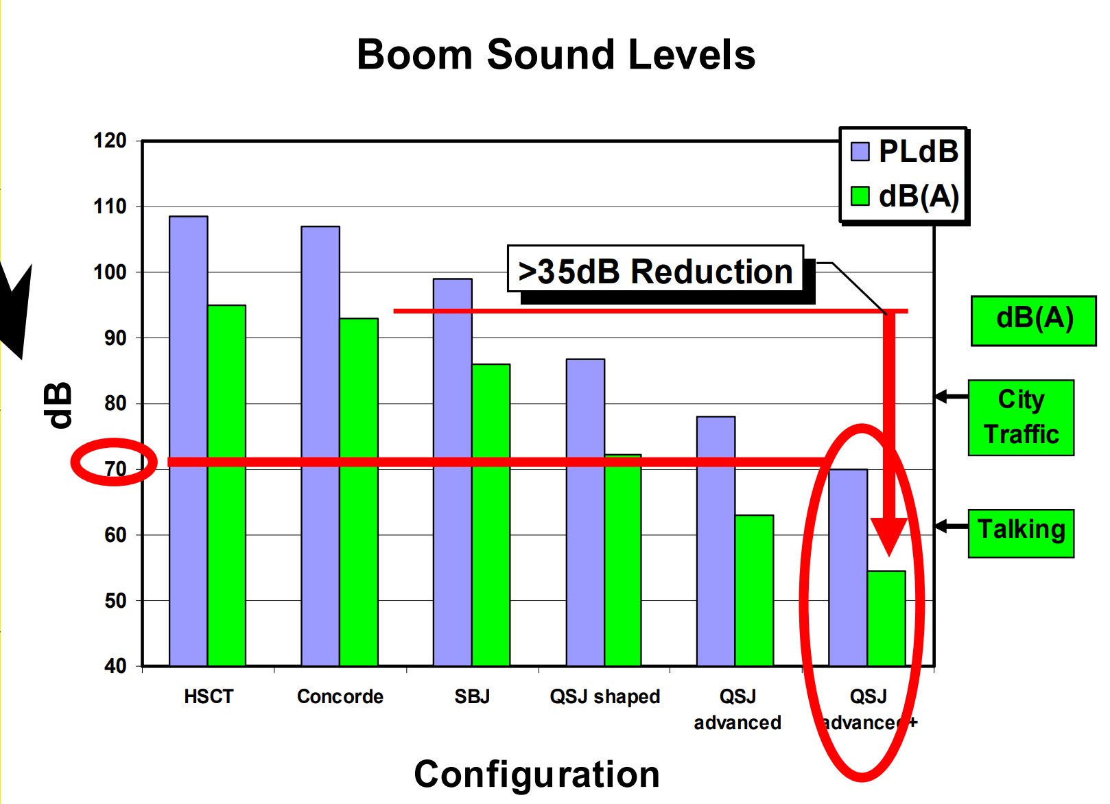 Das Bild unten zeigt, dass der Quiet Spike den Boom-Geräuschpegel um über 35 dB reduzierte, verglichen mit dem 94-dB-Boom-Sound von Concorde. Der herkömmliche SBJ reduziert den Boom-Sound leicht auf 86 dB, während der Quite Spike etwa 54 dB ergibt.