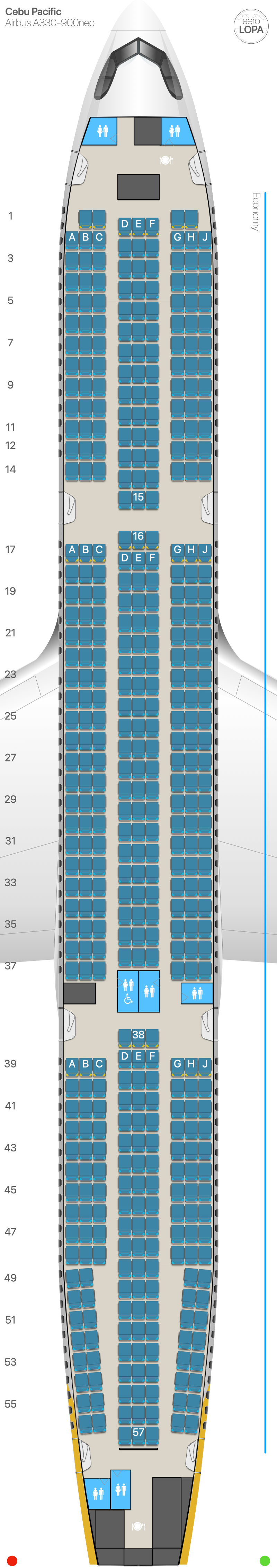 Cebu Pacific Air betreibt eine Flotte von zehn Airbus A330-900, weitere sechs sind bestellt. Cebu Pacific A330-900 sind mit 449 Sitzen in einer Einzelkabinenklasse in einer 3-3-3-Konfiguration ausgestattet. Aufgrund der konvergierenden Form des A330-900-Heckteils ändert sich die Sitzanordnung zum Heck des Flugzeugs hin in den Reihen 50 bis 57 zu 2-3-2.